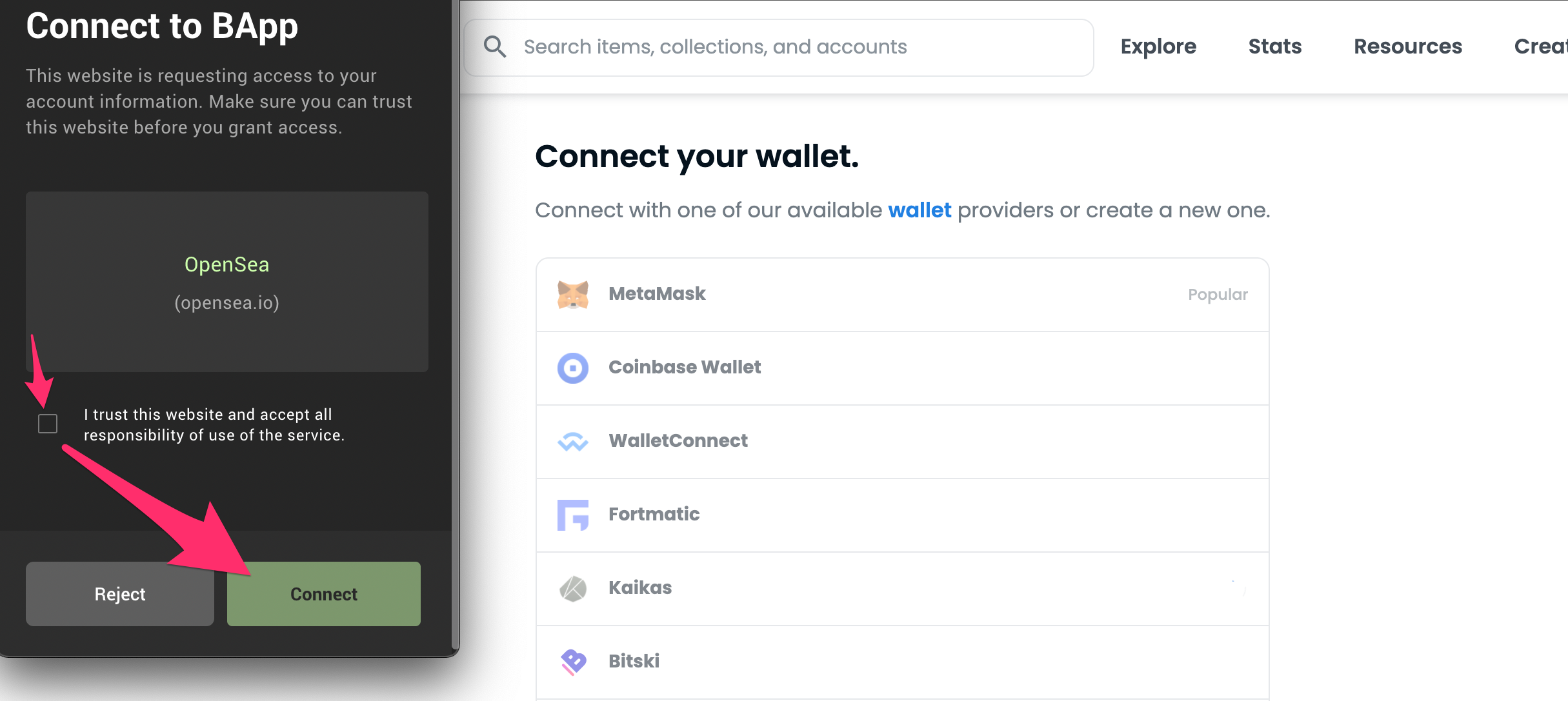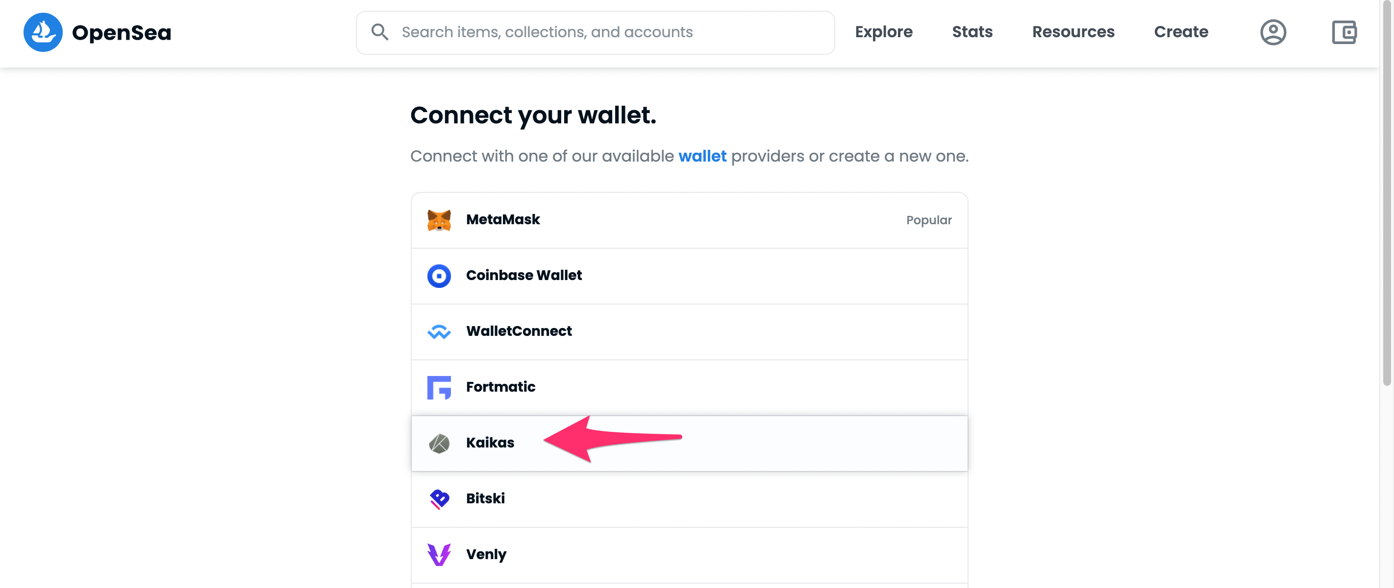 OpenSea(https://opensea.io)로 이동합니다. 계속 Kaikas 지갑은 활성화된 상태여야 합니다.