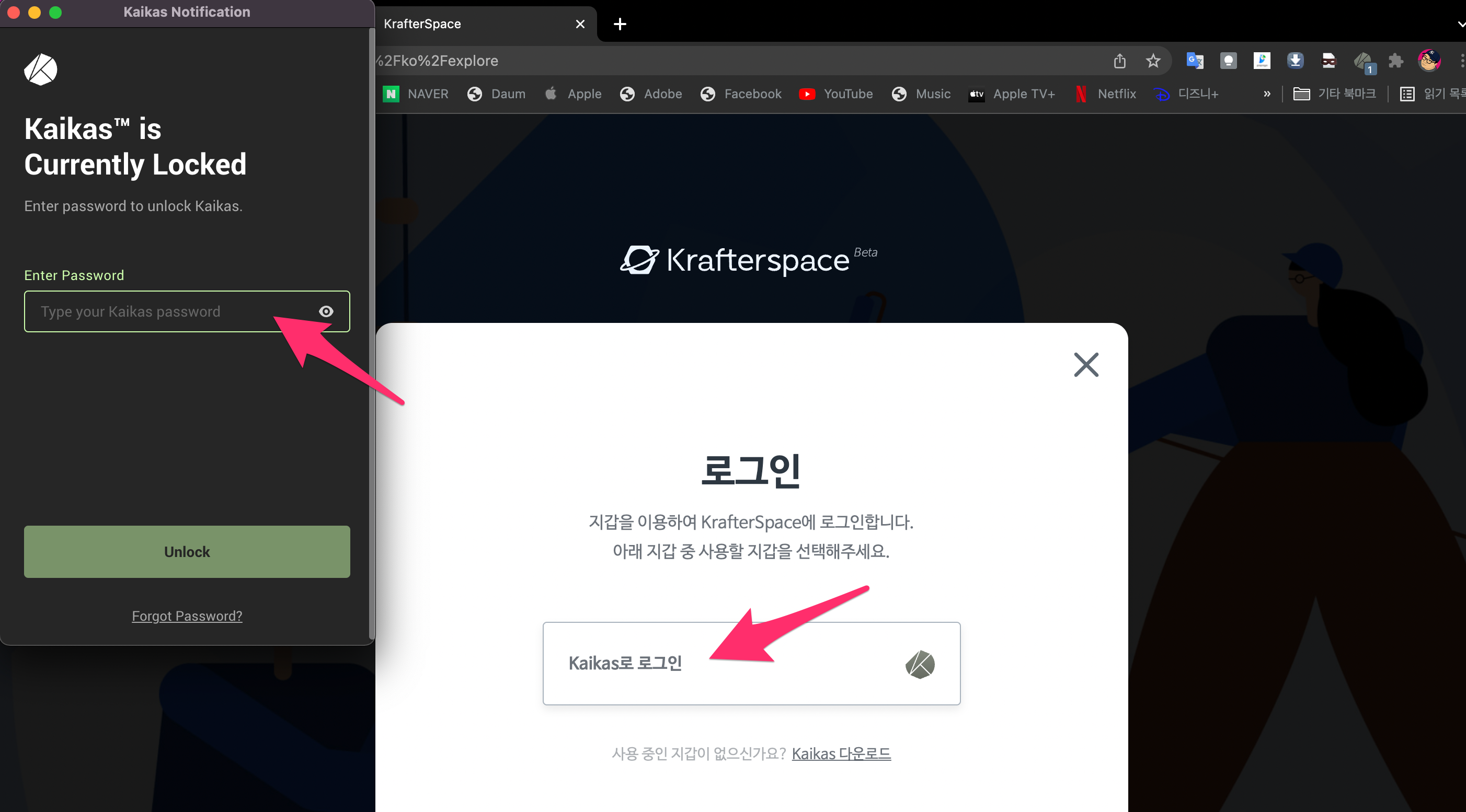 로그인 창에서 Kaikas로 로그인을 선택하면 Kaikas 확장 프로그램이 실행합니다.