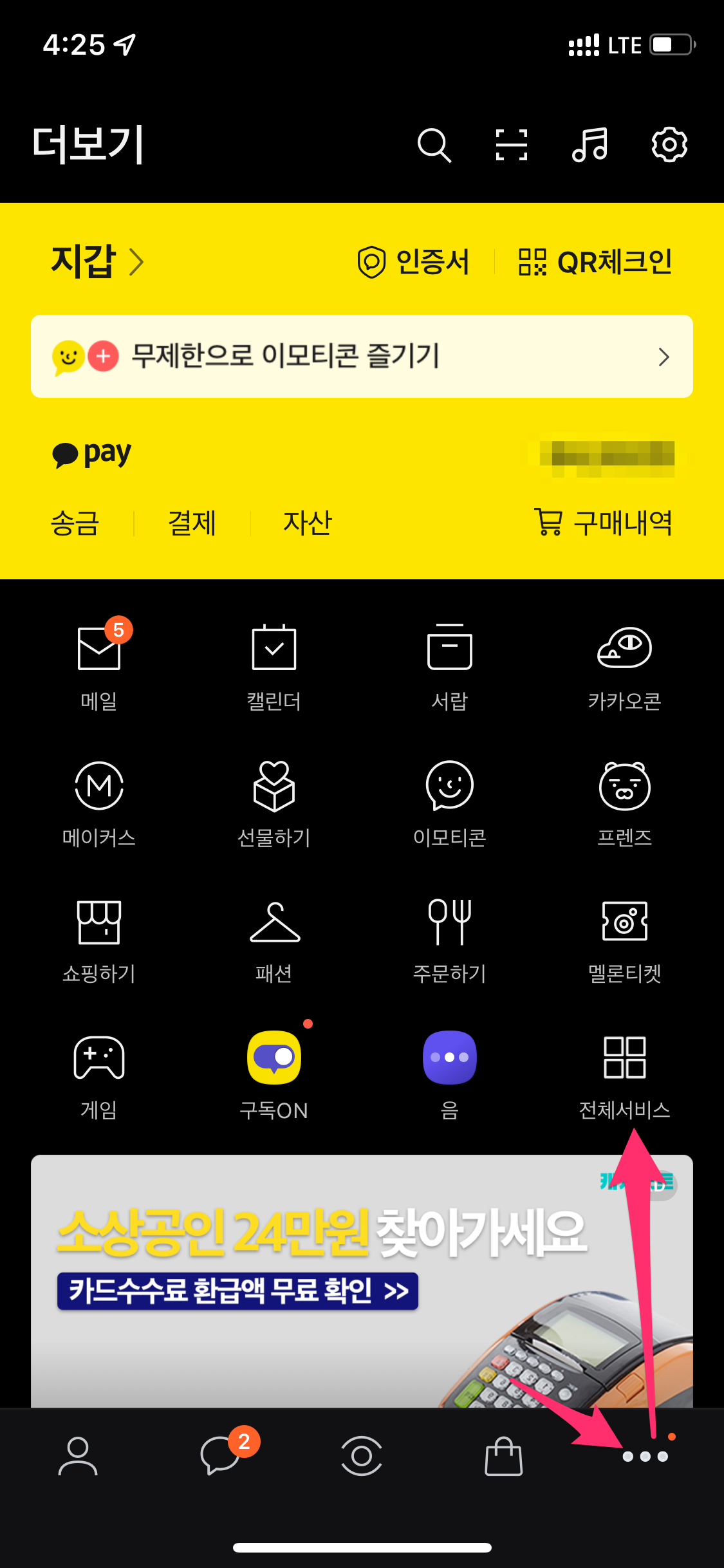 우선 카카오톡을 접속하여 오른쪽 하단 더보기(점3개)를 선택한 후에 전체서비스를 선택합니다.