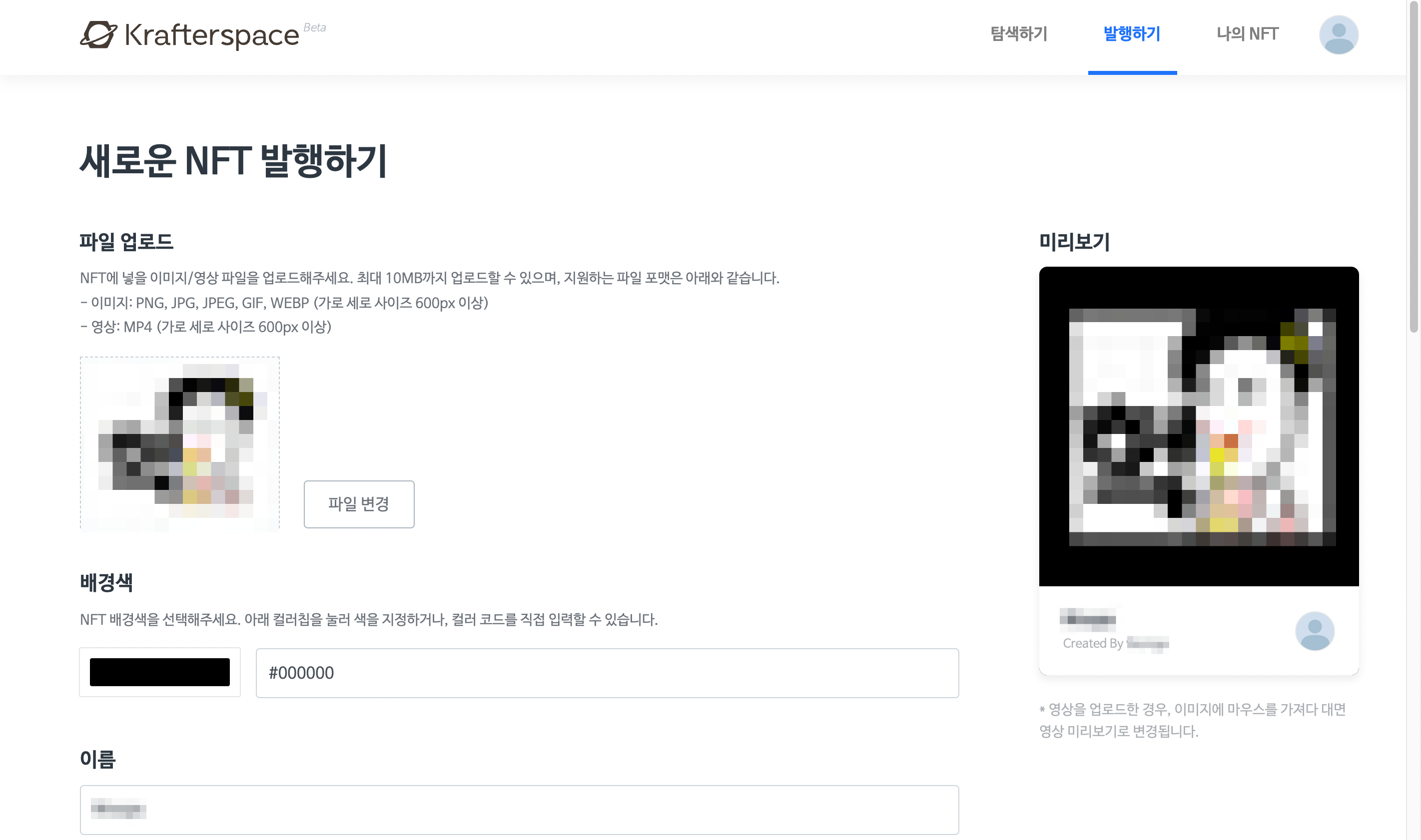 4. Krafterspace에서 내가 그린 그림을 업로드하여 NFT로 발행합니다.