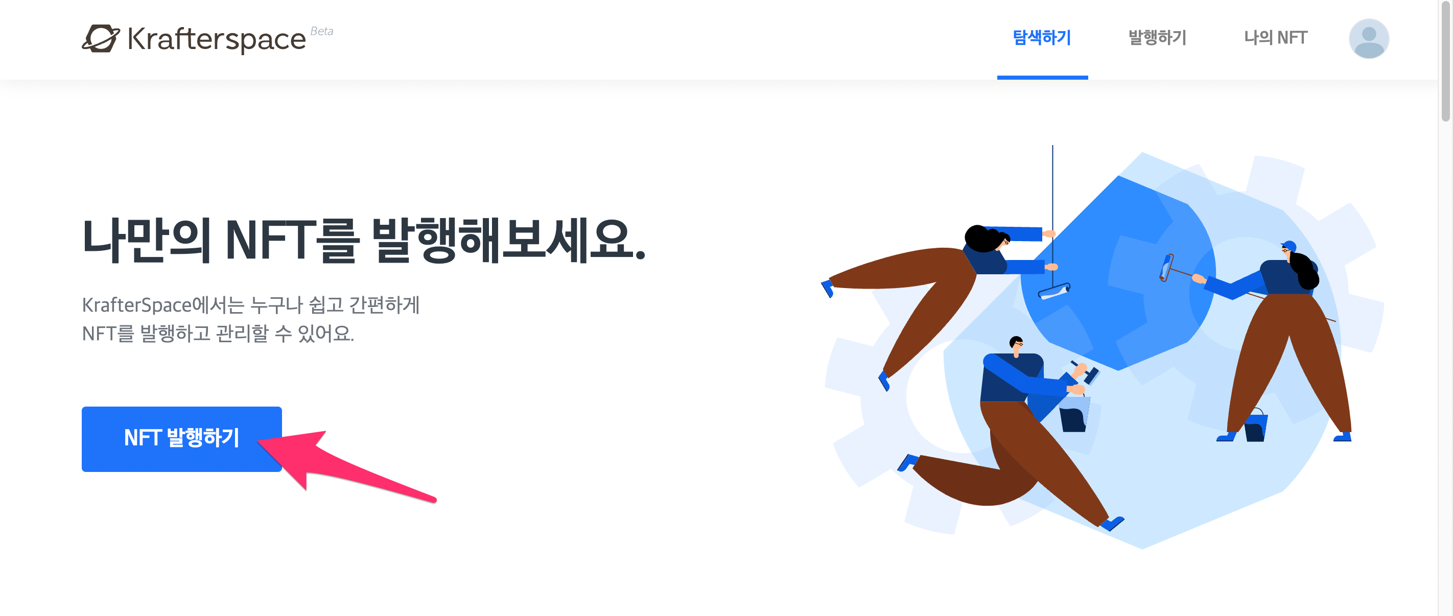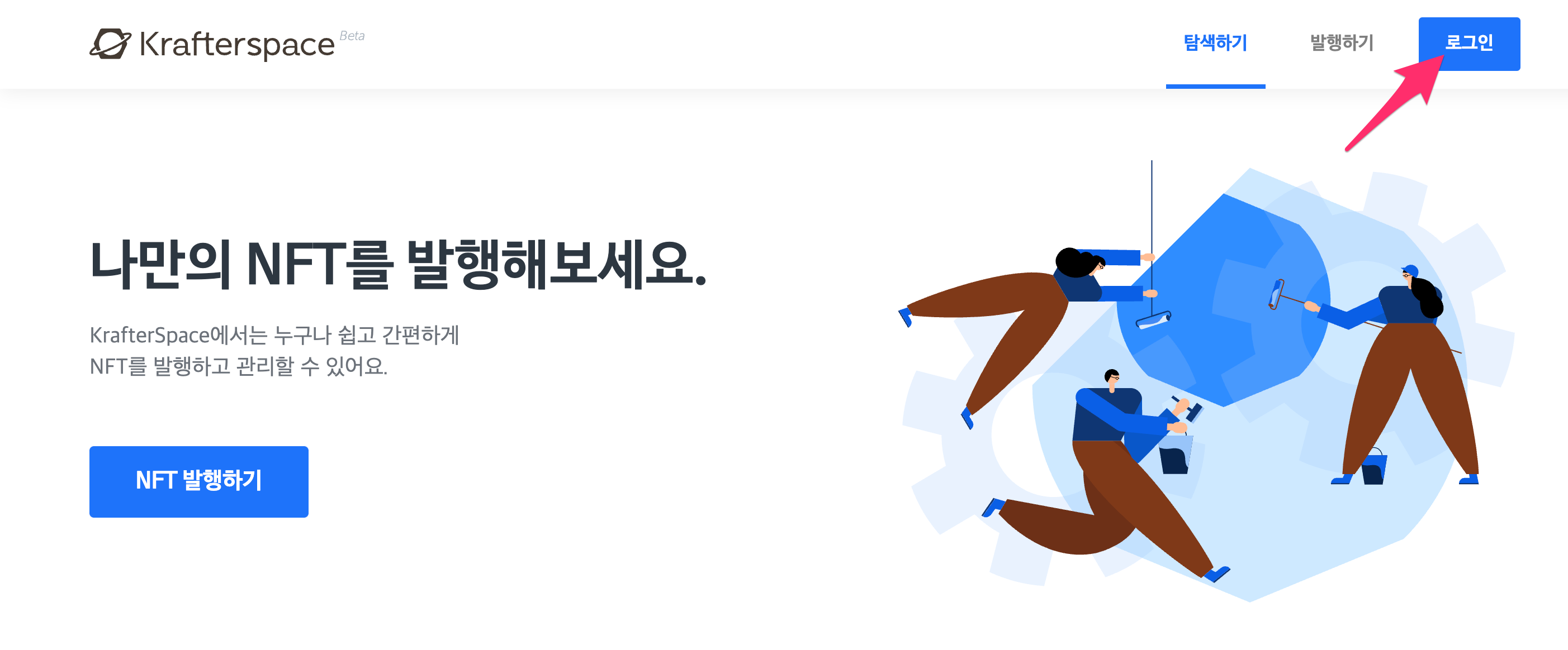 Kaikas 지갑이 활성화된 상태에서 Krafterspace(https://krafter.space/ko/explore) 홈페이지로 이동한 후에 로그인합니다.