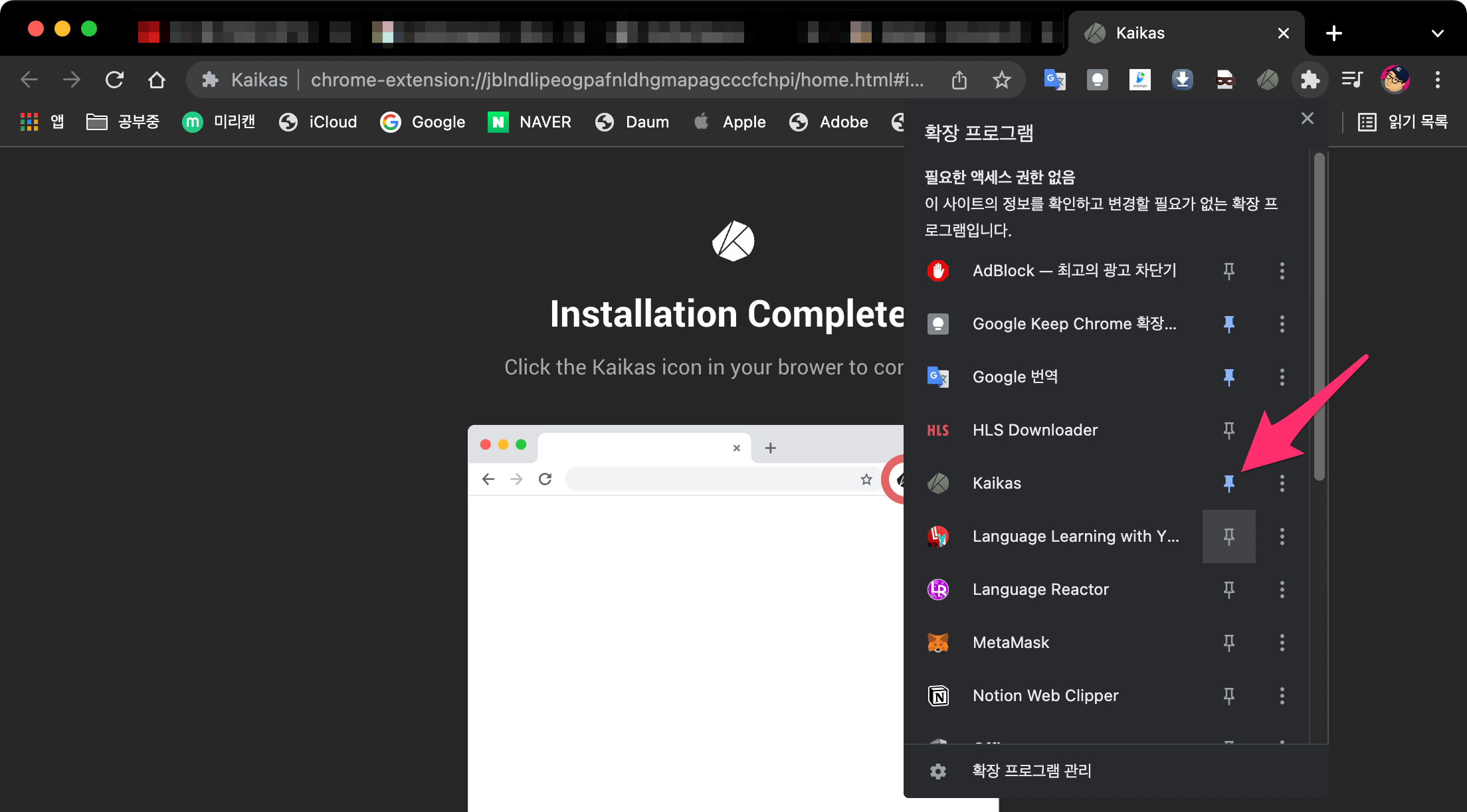확장 프로그램 목록 중에서 Kaikas 옆에 있는 핀을 선택하여 고정(파란색) 합니다.