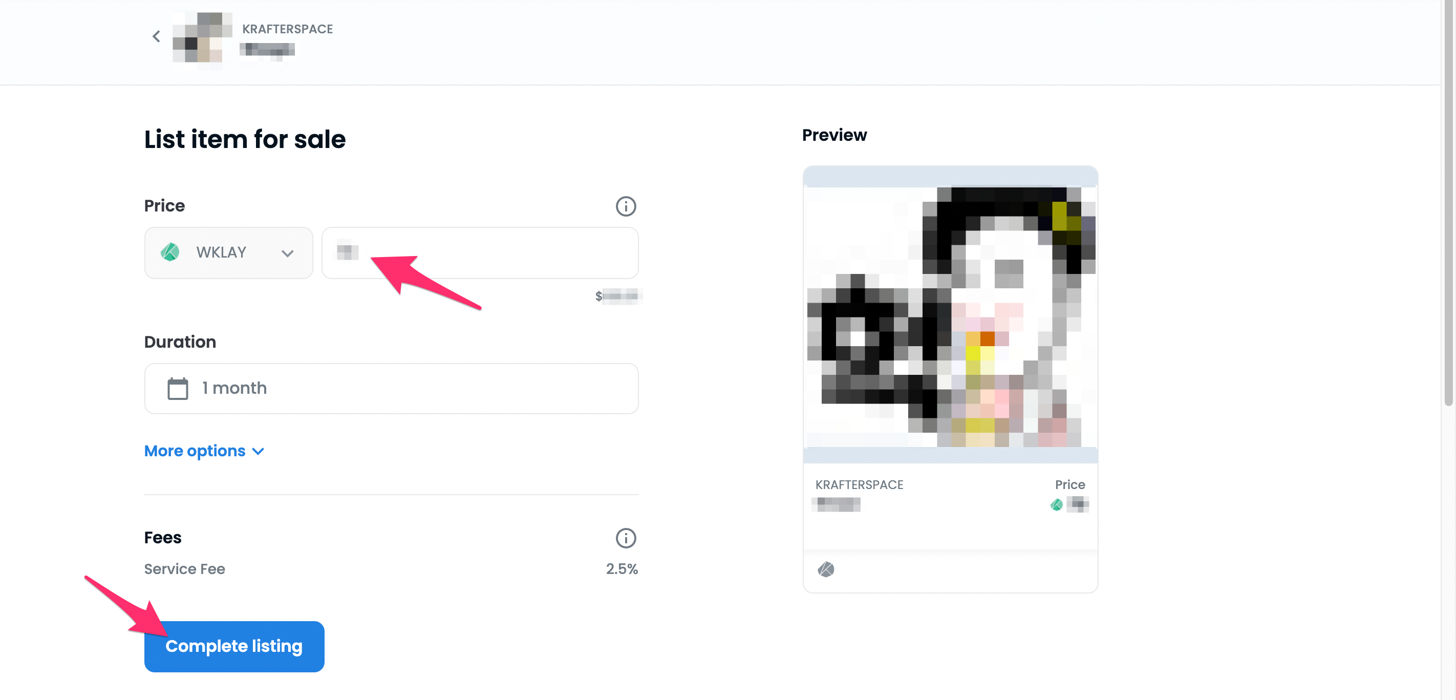 가격(Price)를 정하고 기간(Duration)를 정한 후에 Complete listing 버튼을 선택합니다.