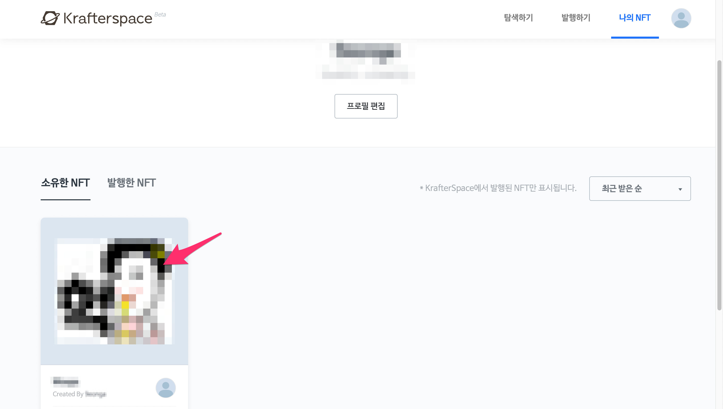 그러면 아까 Krafterspace(https://krafter.space/ko/explore)에서 올린 NFT를 확인하고 선택합니다.