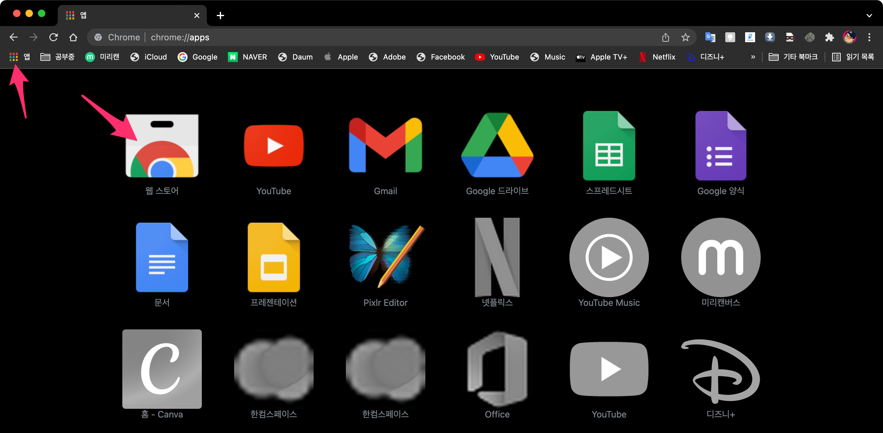 우선 크롬 브라우저가 필요합니다. 크롬 브라우저 화면에서 왼쪽 상단에 앱 아이콘을 클릭하거나 웹 스토어로 들어가시면 됩니다.