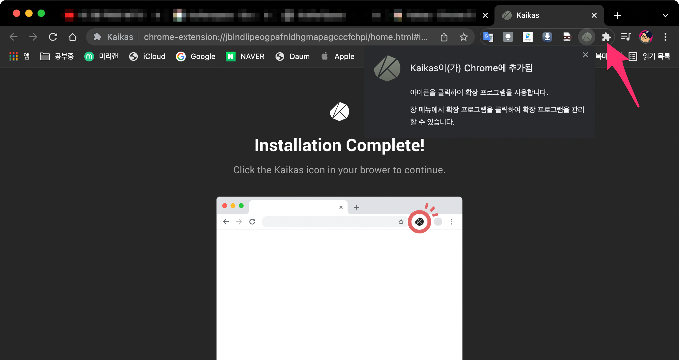 2. 크롬 브라우저에 Kaikas 지갑을 장착합니다. (이후 모든 과정에서 Kaikas 지갑은 계속 활성화)