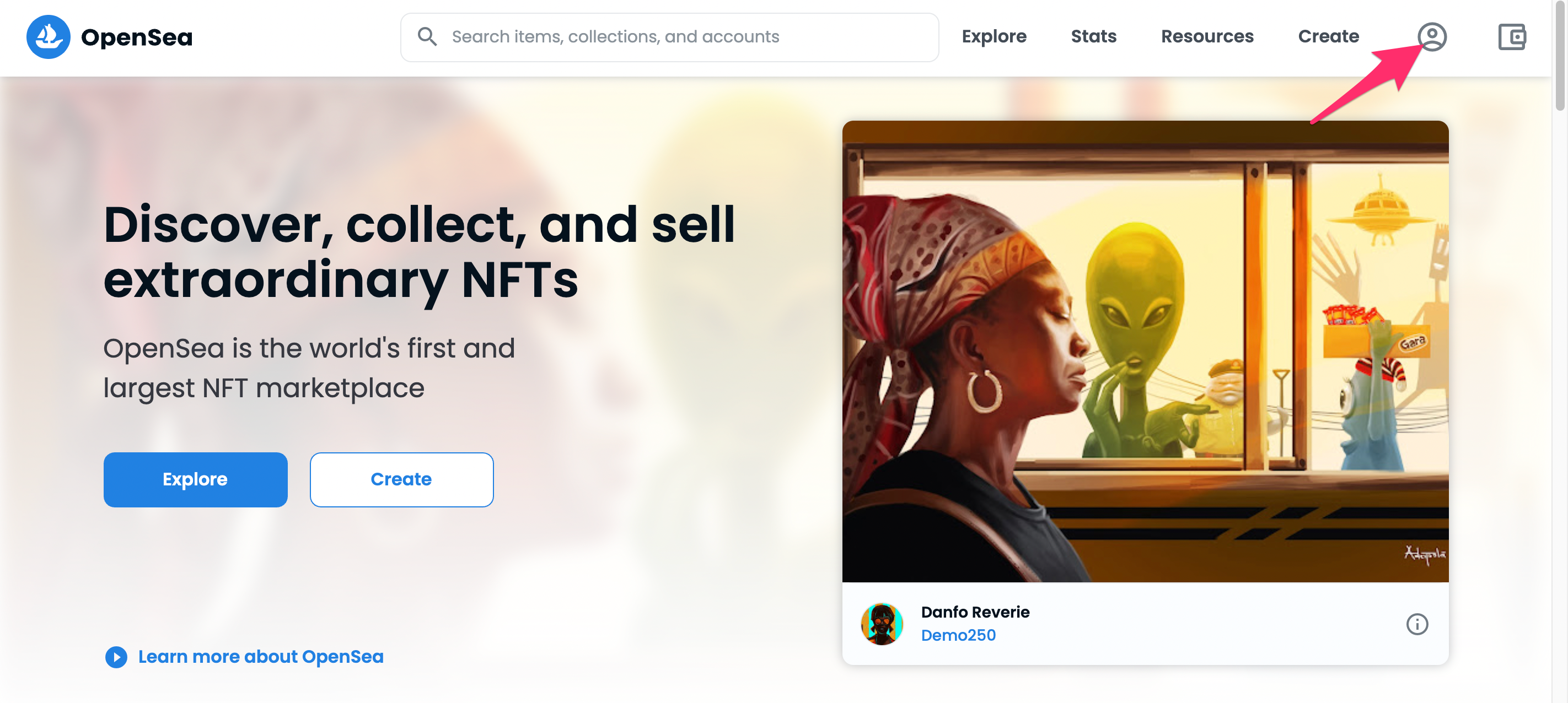 OpenSea(https://opensea.io)로 이동합니다. 계속 Kaikas 지갑은 활성화된 상태여야 합니다.