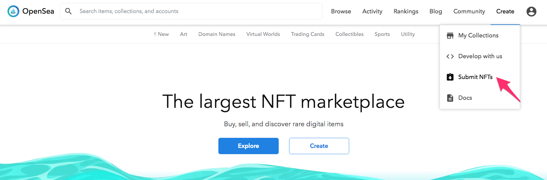 메인화면 오른쪽 상단에 Create 메뉴에 Submit NFTs 을 선택합니다.