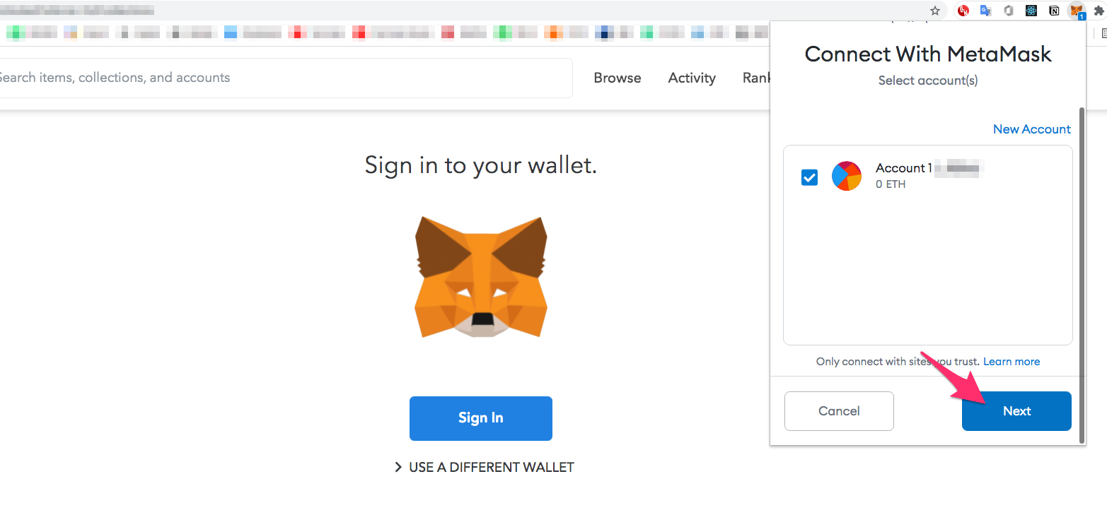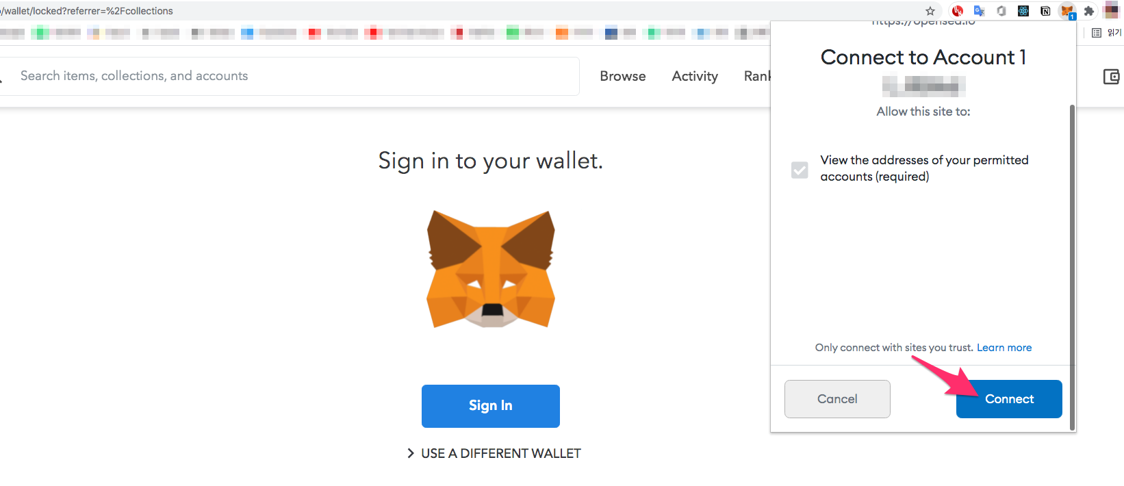 Sign In 버튼을 누르면 metamask 크롬 확장프로그램이 열립니다.