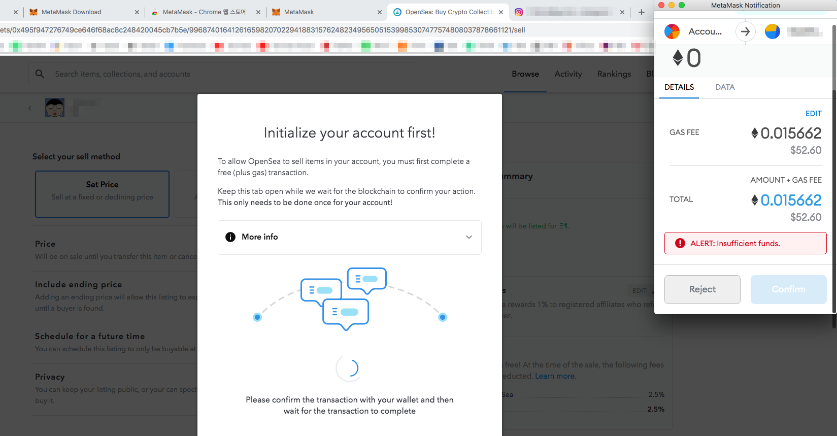 왜냐하면 가입비 같은 것을 내야 합니다. 보시면 아시겠지만 이더리움 0.015662개가 필요합니다.