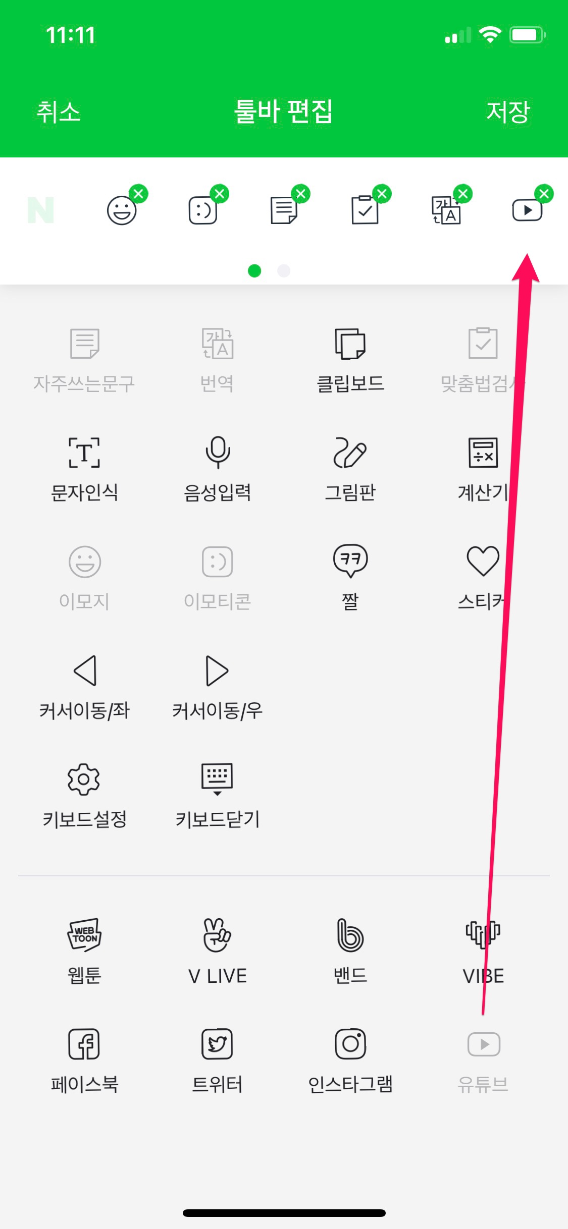 원하는 기능을 상단에 올리면(꾹 누르면 이동가능) 되고 삭제하고 싶으면 아이콘 옆에 X를 누르면 삭제됩니다.