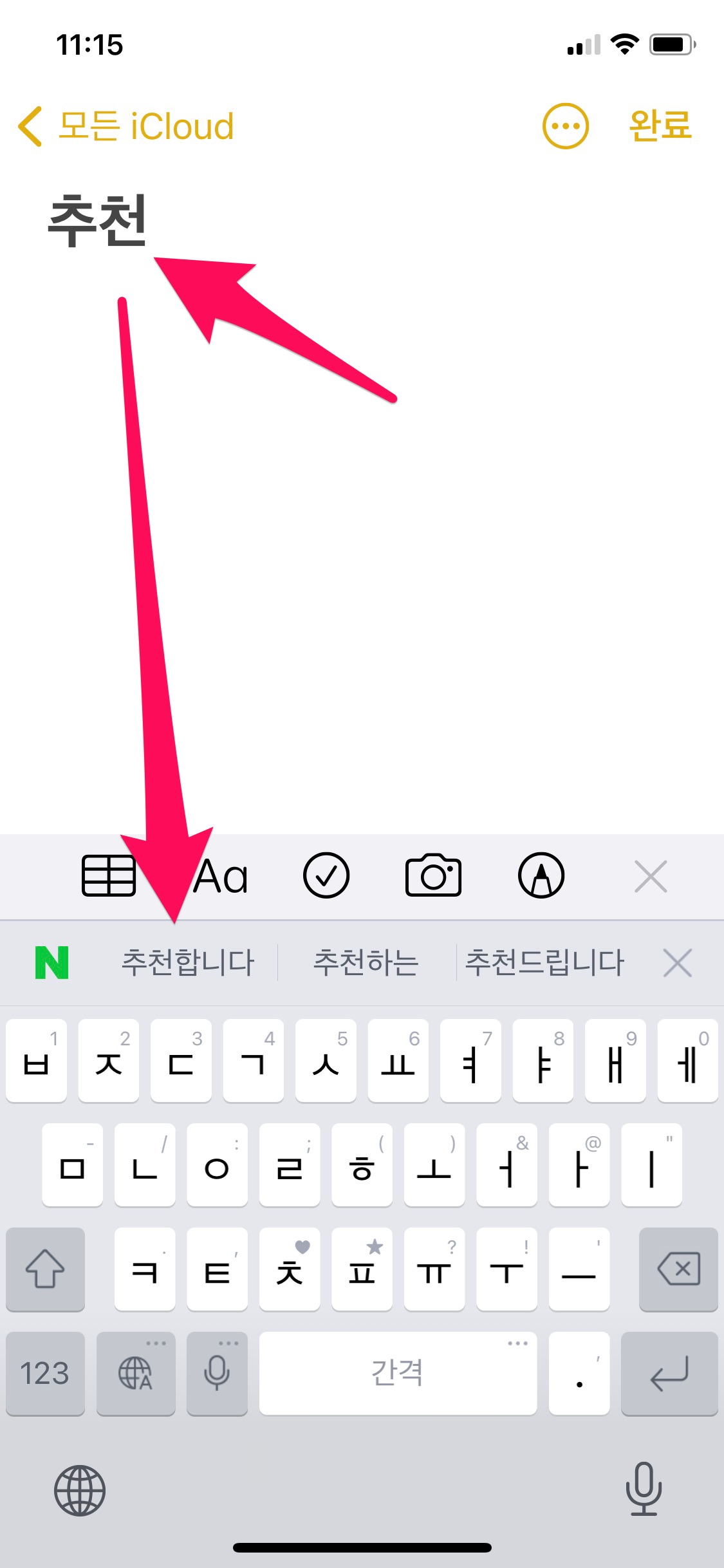 추천 단어 표시 및 오타 교정어 추천을 선택하면 키보드에서 추천어와 교정어를 추천하여 보여주고 선택하면 변경됩니다.