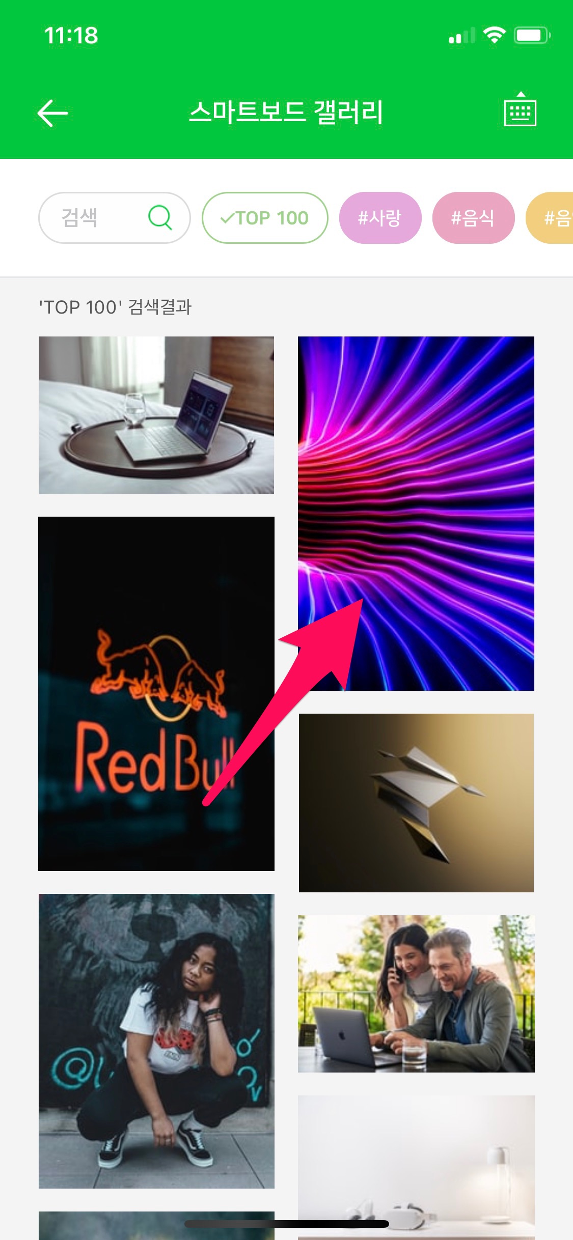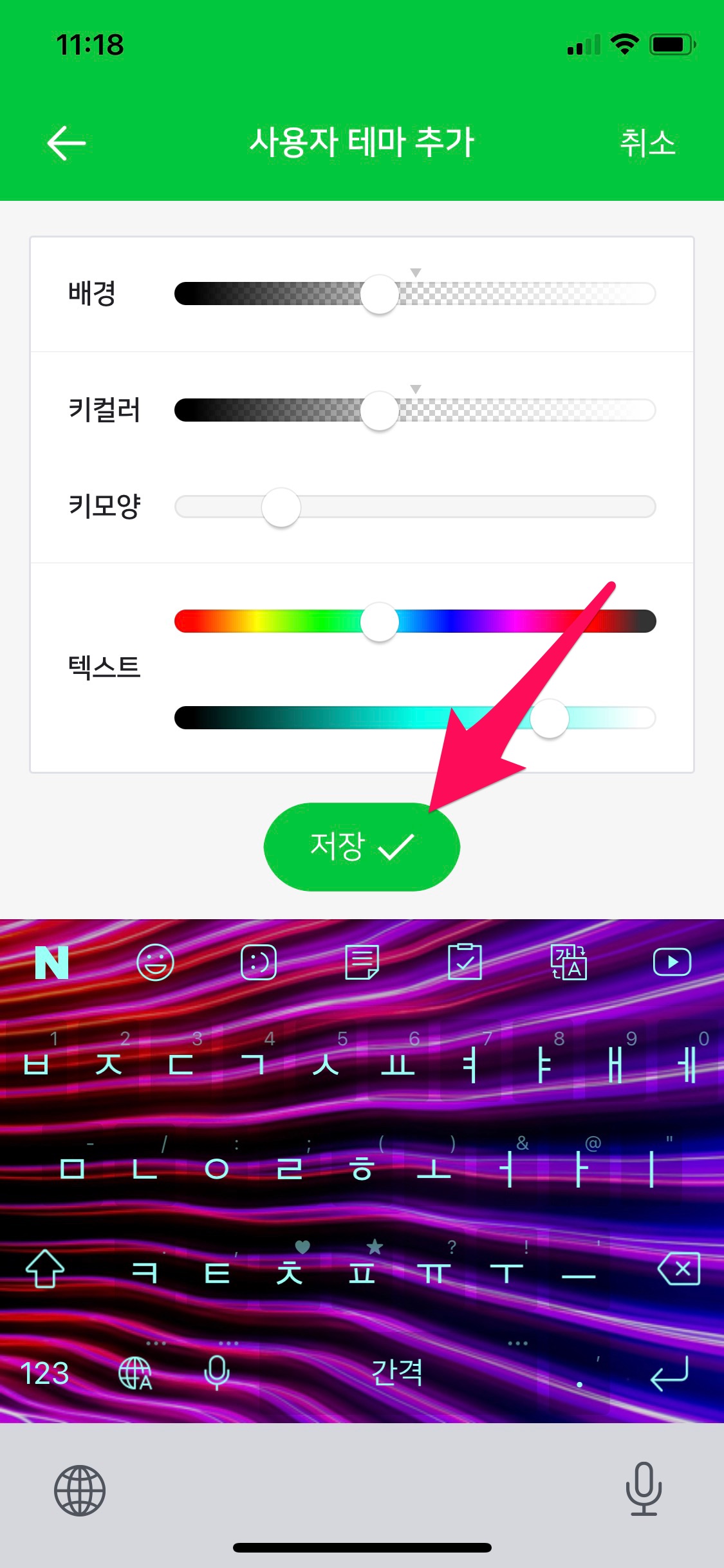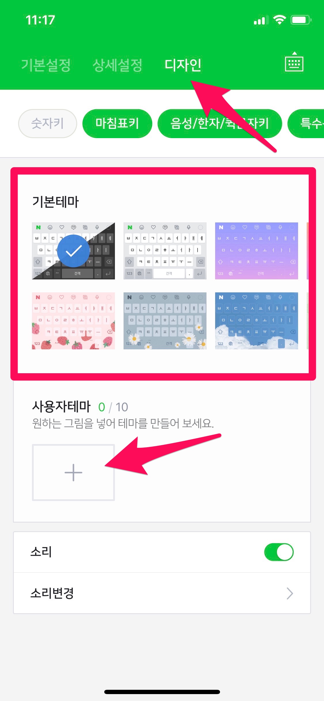 기본 테마에서 네이버에서 제작한 테마를 선택할 수 있고 사용자 테마를 선택하면 내가 촬영한 사진이나 스마트보드 갤러리에서 본인이 원하는 사진을 키보드 배경에 삽입할 수 있습니다.