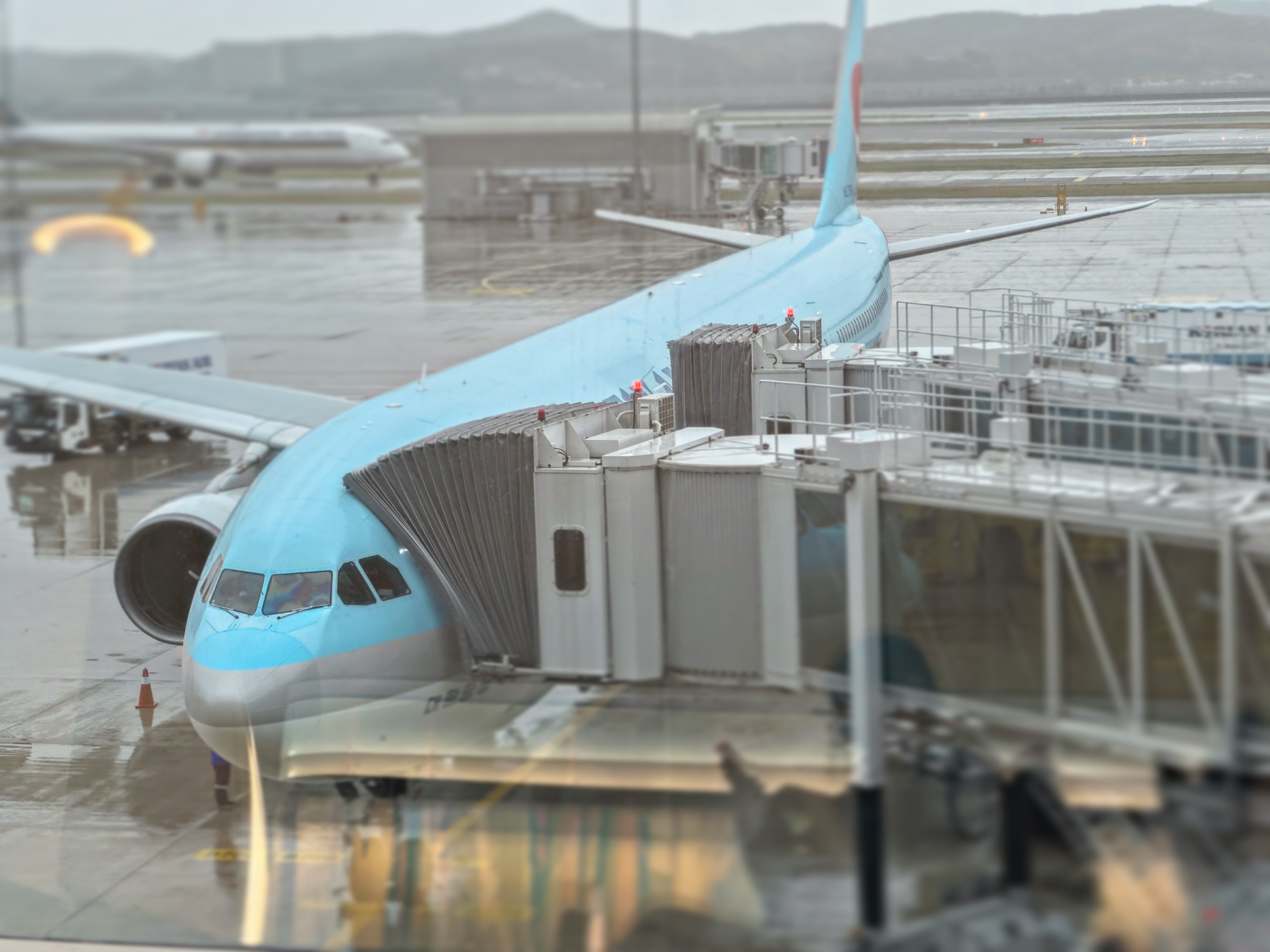 비가 내리는 활주로를 바라보며 커피 한 잔을 마시는데, 이상하게도 시원함이 느껴졌습니다.