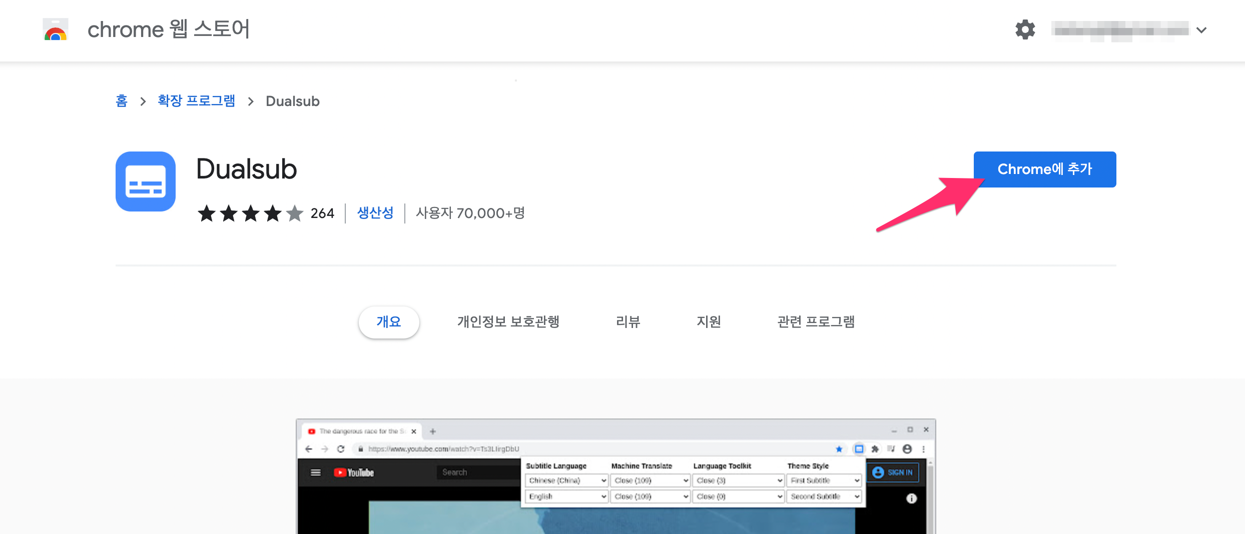크롬 브라우저를 여신 후에 확장 프로그램인 Dualsub를 설치합니다.(아래 링크 참고)