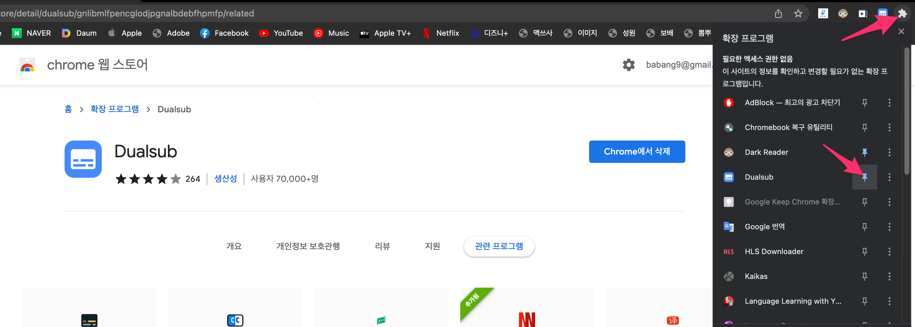 설치 후에 크롬 브라우저 오른쪽 상단에 확장 프로그램 북마크를 선택한 후에 Dualsub 옆에 핀 아이콘을 활성화하여 북마크에 등록합니다.