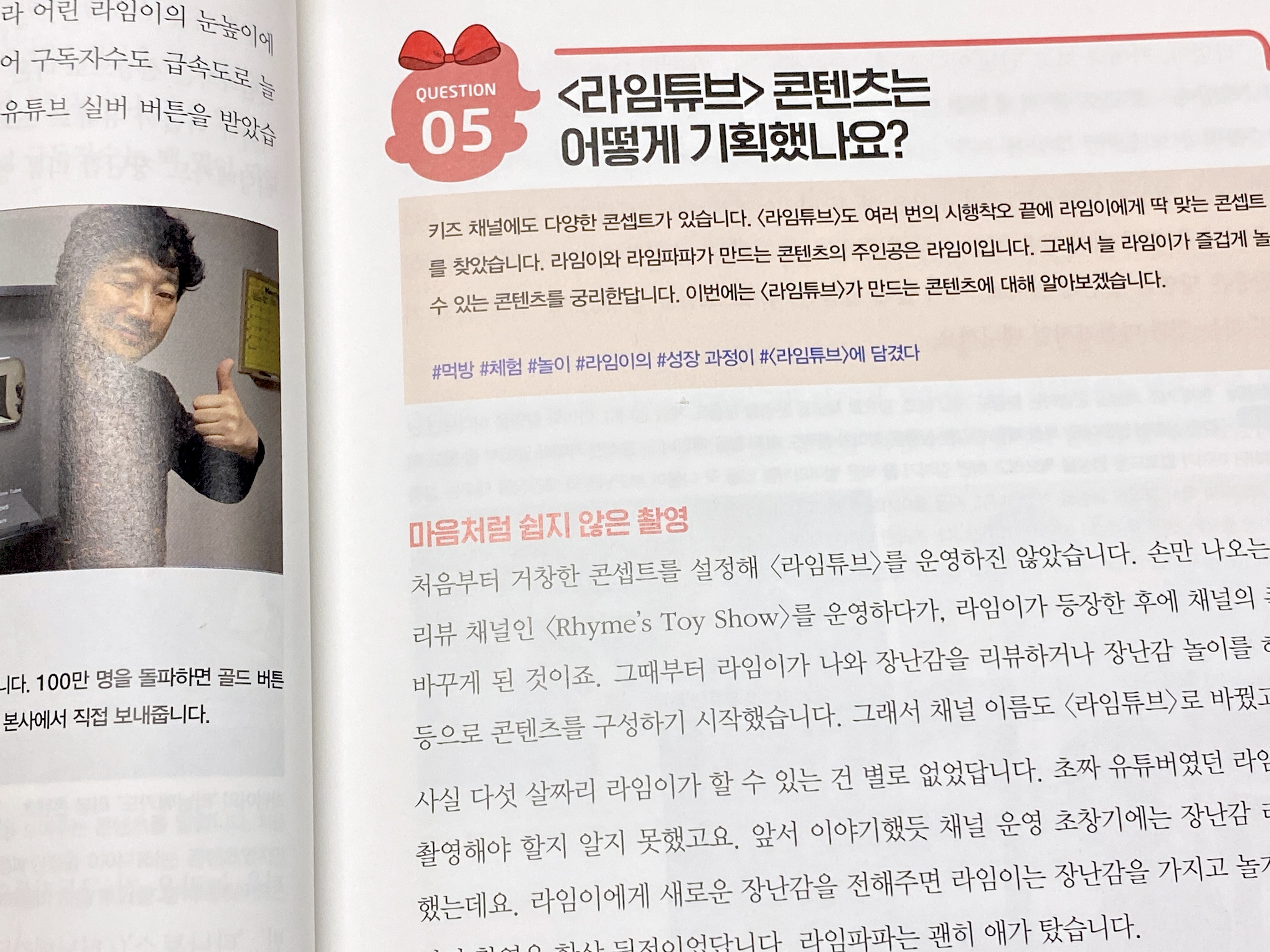 결론부터 말씀드리면 유튜브를 시작하는 부분부터 지금까지 운영하면서 겪은 시행착오부터 기획, 운영 노하우까지 내용이 이어지고 있고 읽으면서 라임튜브의 자서전 느낌도 들었습니다.