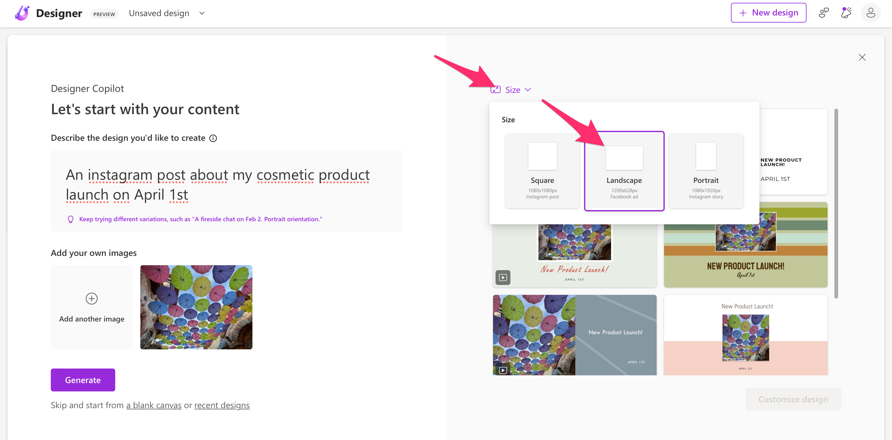 나온 결과물의 사이즈를 변경하려면 오른쪽 상단에 Size를 선택하고 정사각, 가로, 세로형으로 선택하면 됩니다.
