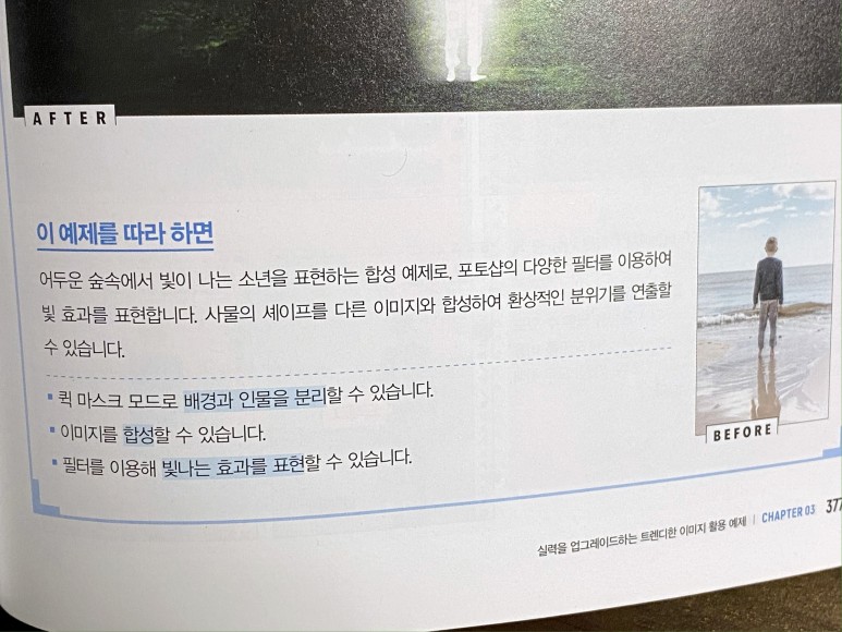 오랜 시간 포토샵을 사용하고 있지만 항상 사용하는 기술만 사용하고 추가되고 있는 기능이나 도구들을 크게 신경쓰지 않다가 최근에 다시 공부하고 싶은 마음에 포토샵 책으로 다시 공부하게 되었습니다.