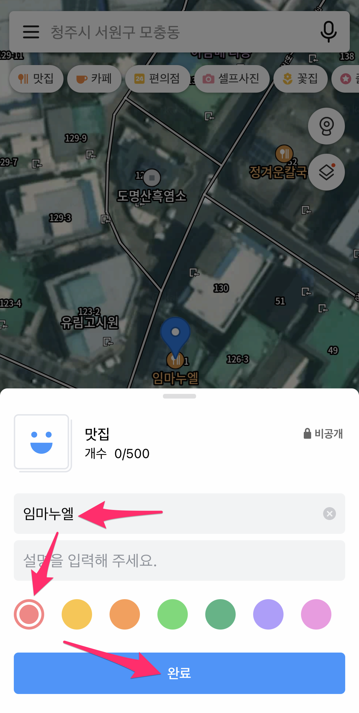 이름과 색상을 선택한 후에 완료하면 지도에 즐겨찾기 아이콘이 보입니다.