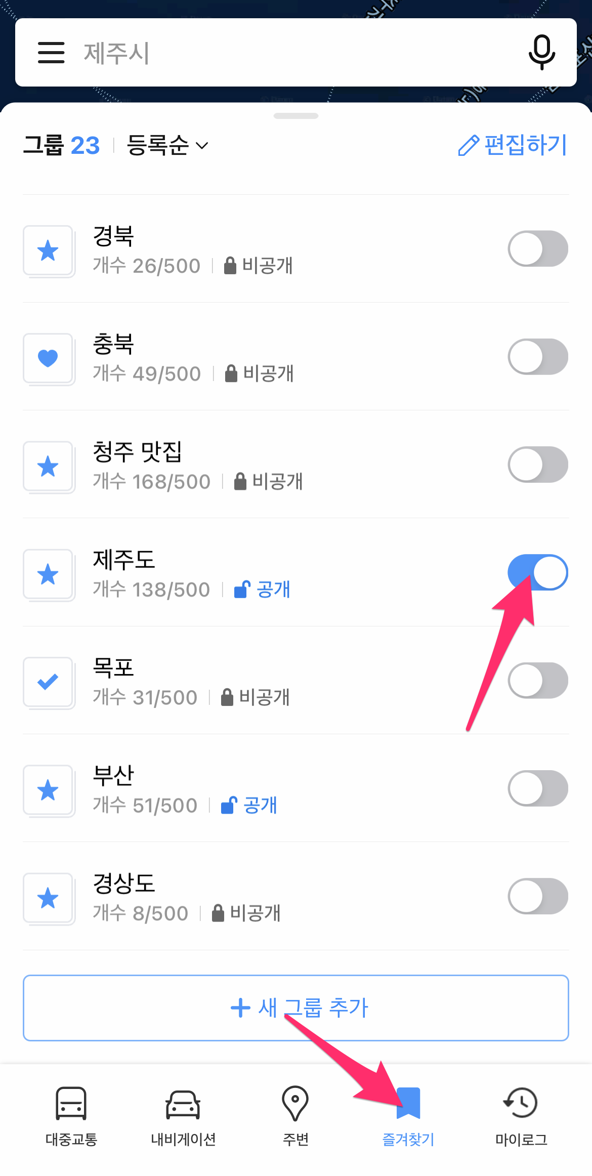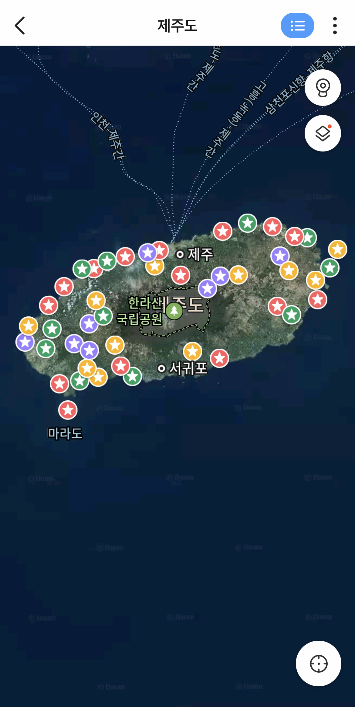 이제 그동안 저장했던 제주도 즐겨찾기해둔 장소를 지도로 확인할 수 있습니다.