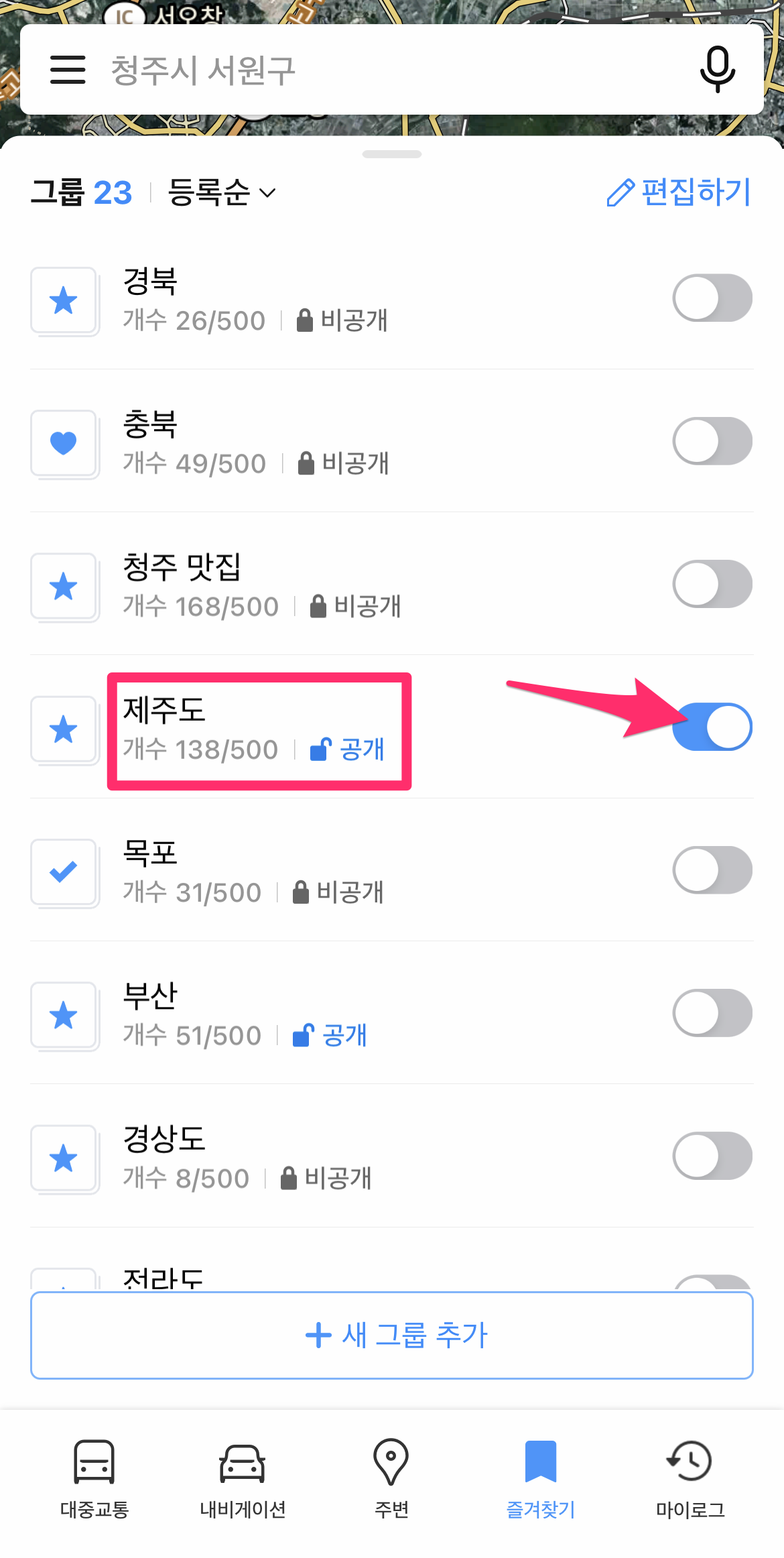 그룹마다 500개를 저장할 수 있기에 저는 지역별로 구분해서 저장했습니다.