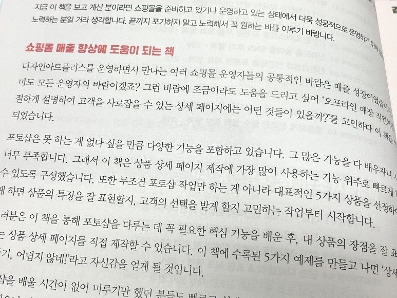 도서를 다 읽고 나서 느낀 점은 쇼핑몰 상세페이지 디자인이라고 하기에는 응용할 수 있는 디자인들이 많아서 다양하게 응용만 한다면 유튜브나 인쇄쪽까지도 활용할 수 있을 것 같습니다.