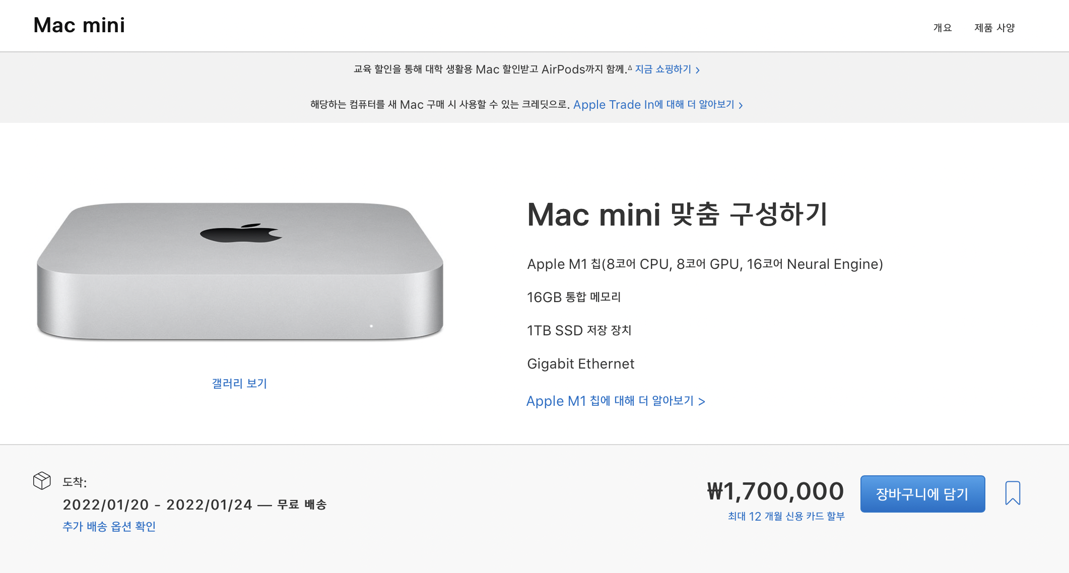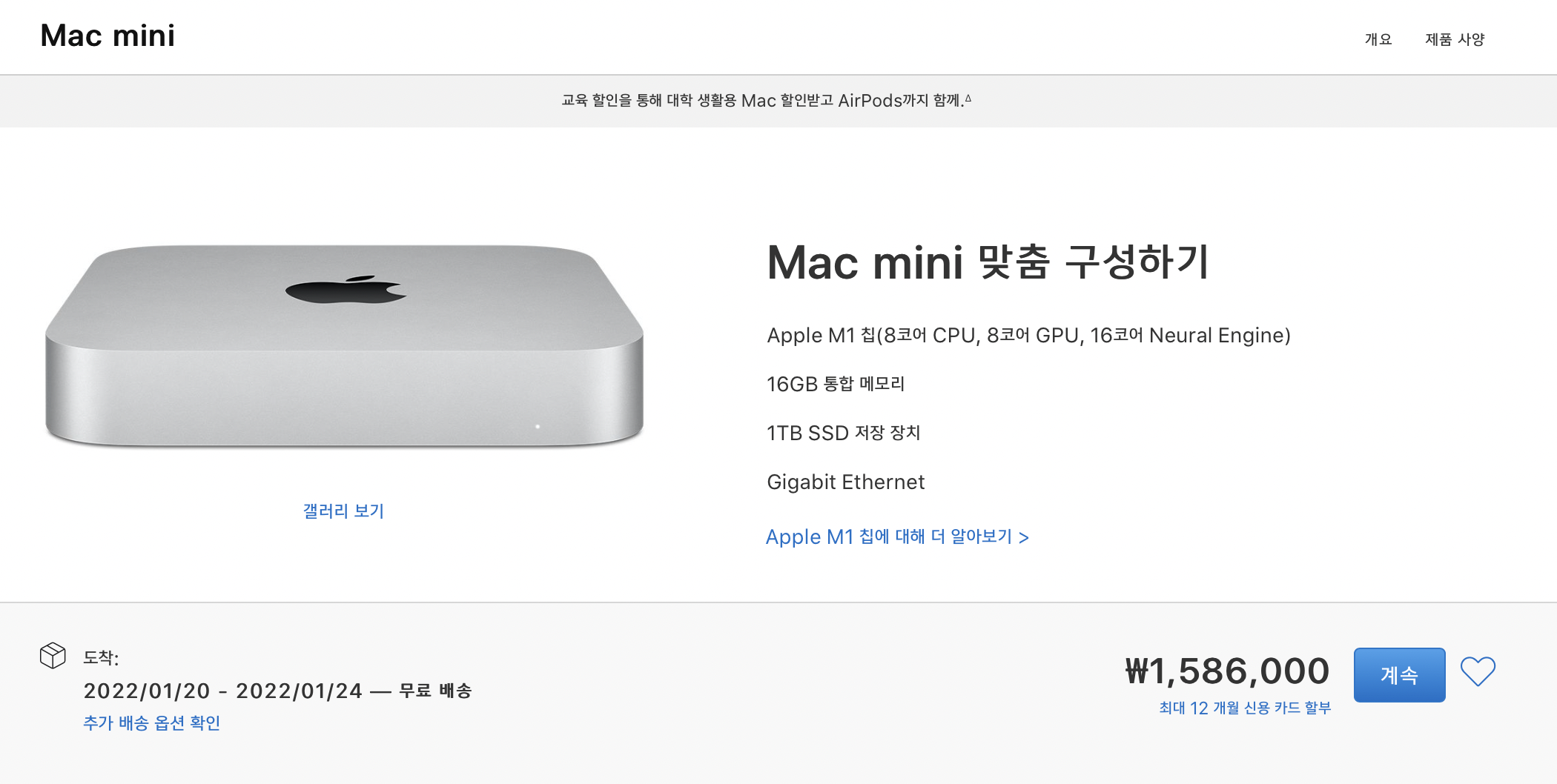 이번에 맥미니(메모리 16G, 하드용량 1TB)를 구입하려고 보니 정가는 1,700,000원이지만 교육 할인으로 1,586,000원(최대 12개월 무이자 가능)으로 구매 가능합니다.