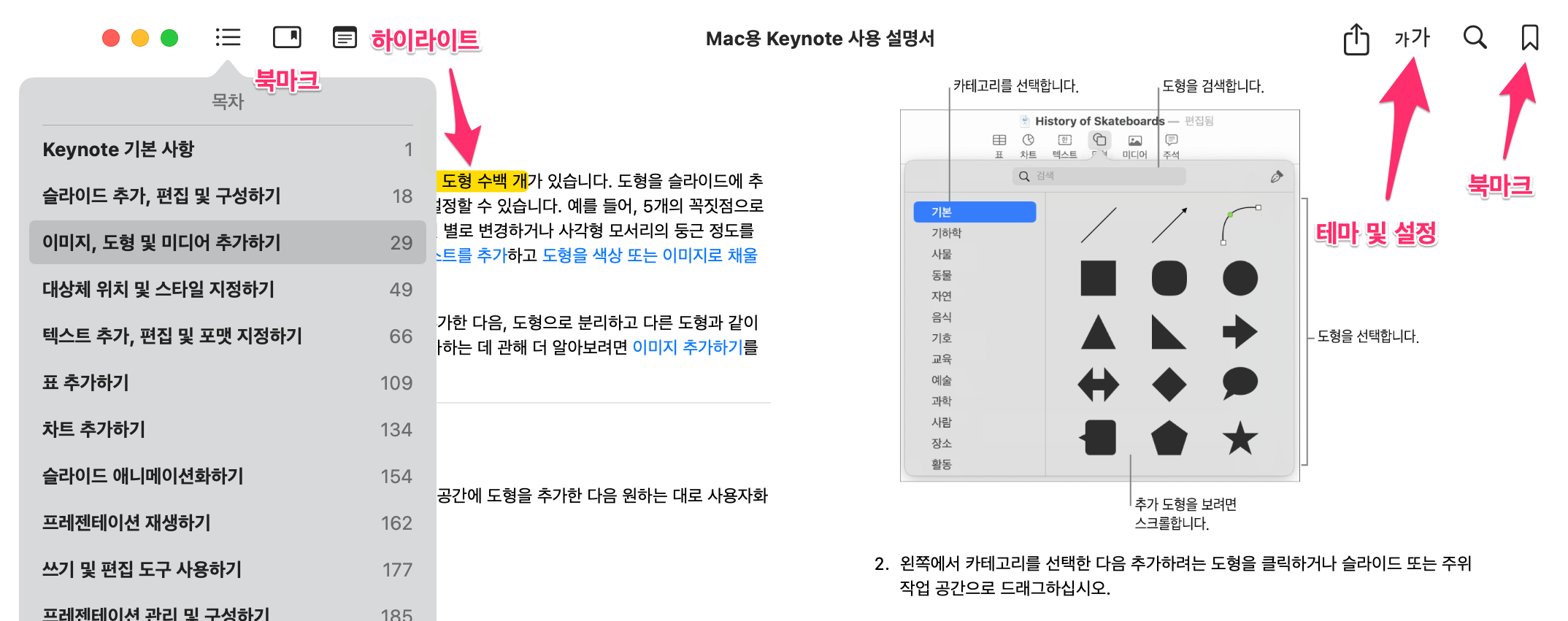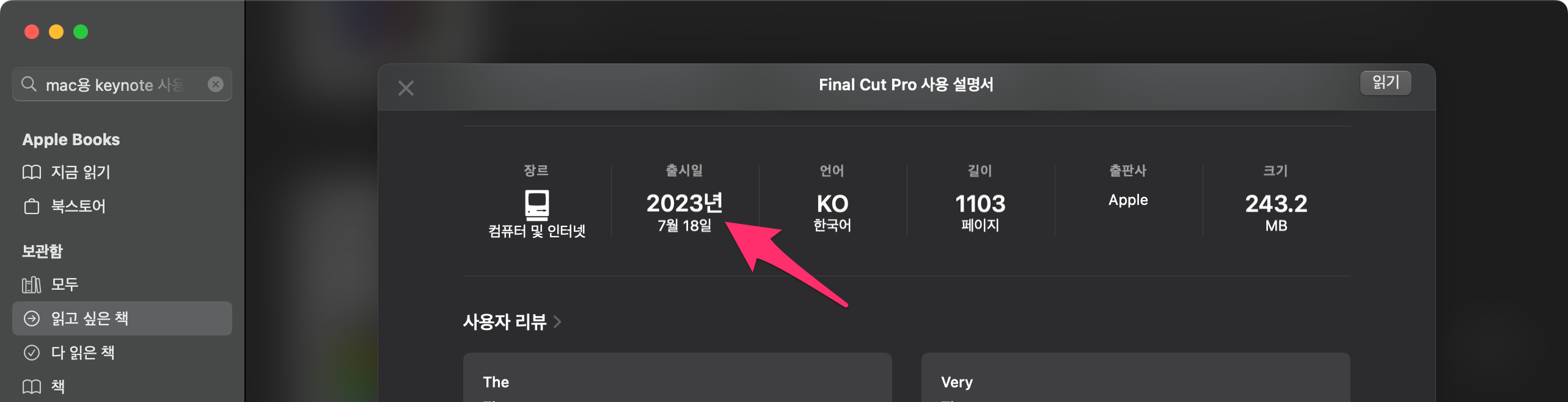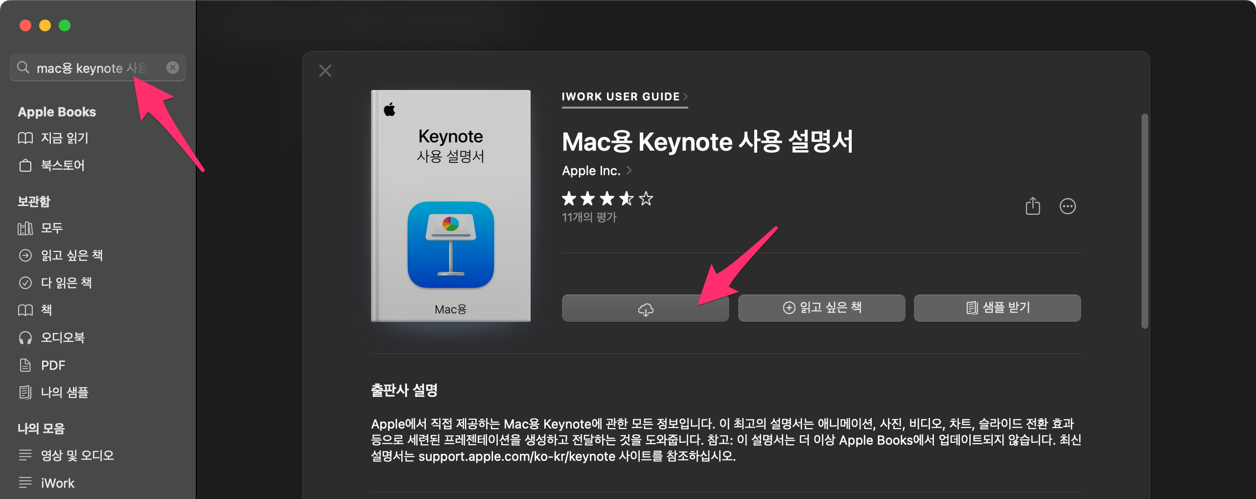 도서앱에서 Keynote 사용 설명서를 검색해서 Mac용 Keynote 사용 설명서를 선택합니다.