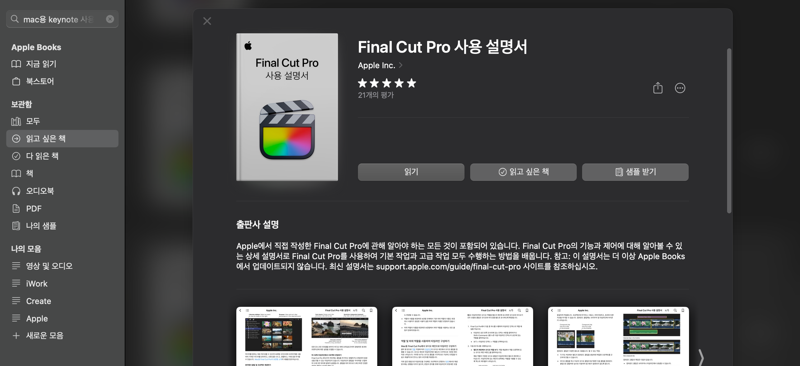 final cut pro, keynote, pages, numbers 프로그램에 대해서 자료가 필요할 때나 주변에서 저 프로그램에 대해서 정보를 알려달라고 할 때 저는 도서앱에서 저 프로그램 매뉴얼을 다운로드하여서 한번 쭉~ 보라고 합니다^^;