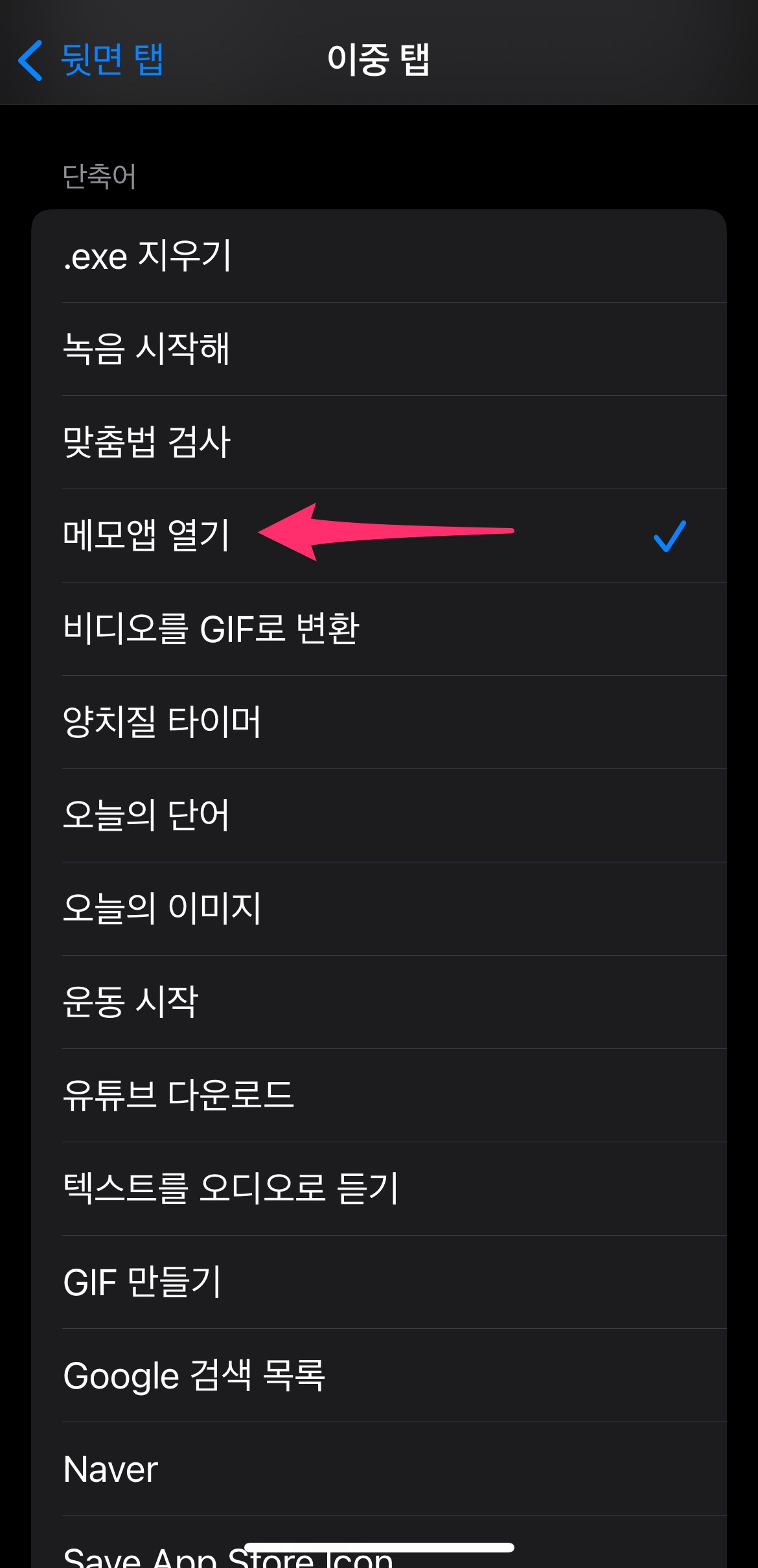 이제 단축어를 이용해서 아이폰 뒷면을 이중 탭 하면 바로 새로운 메모가 생성하게 하겠습니다.