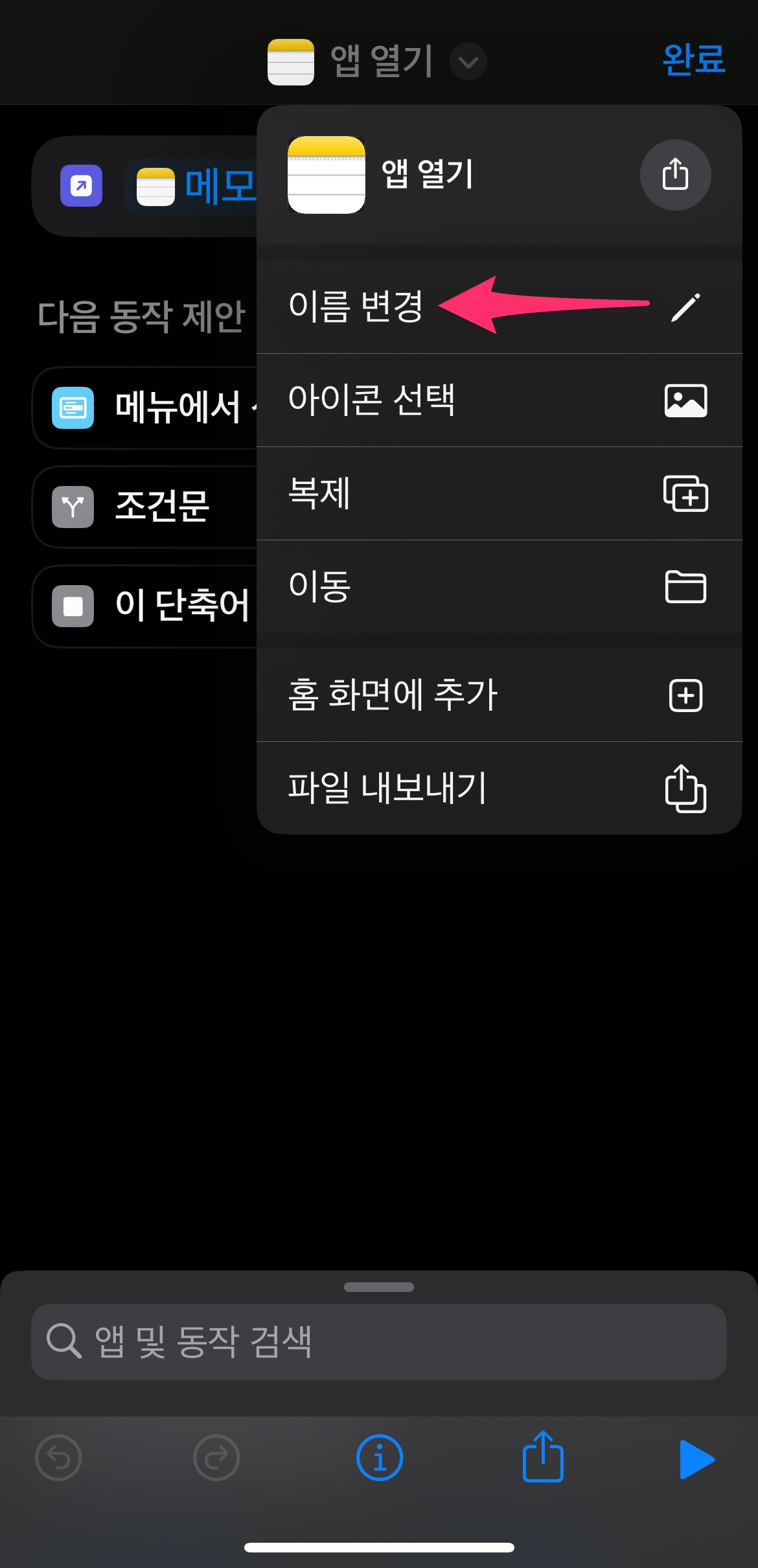 이름 변경을 선택하고 메모앱 열기라고 수정합니다.