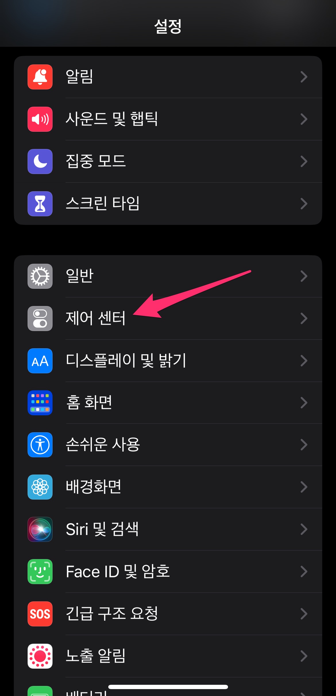 [설정] - [제어센터]를 선택합니다.