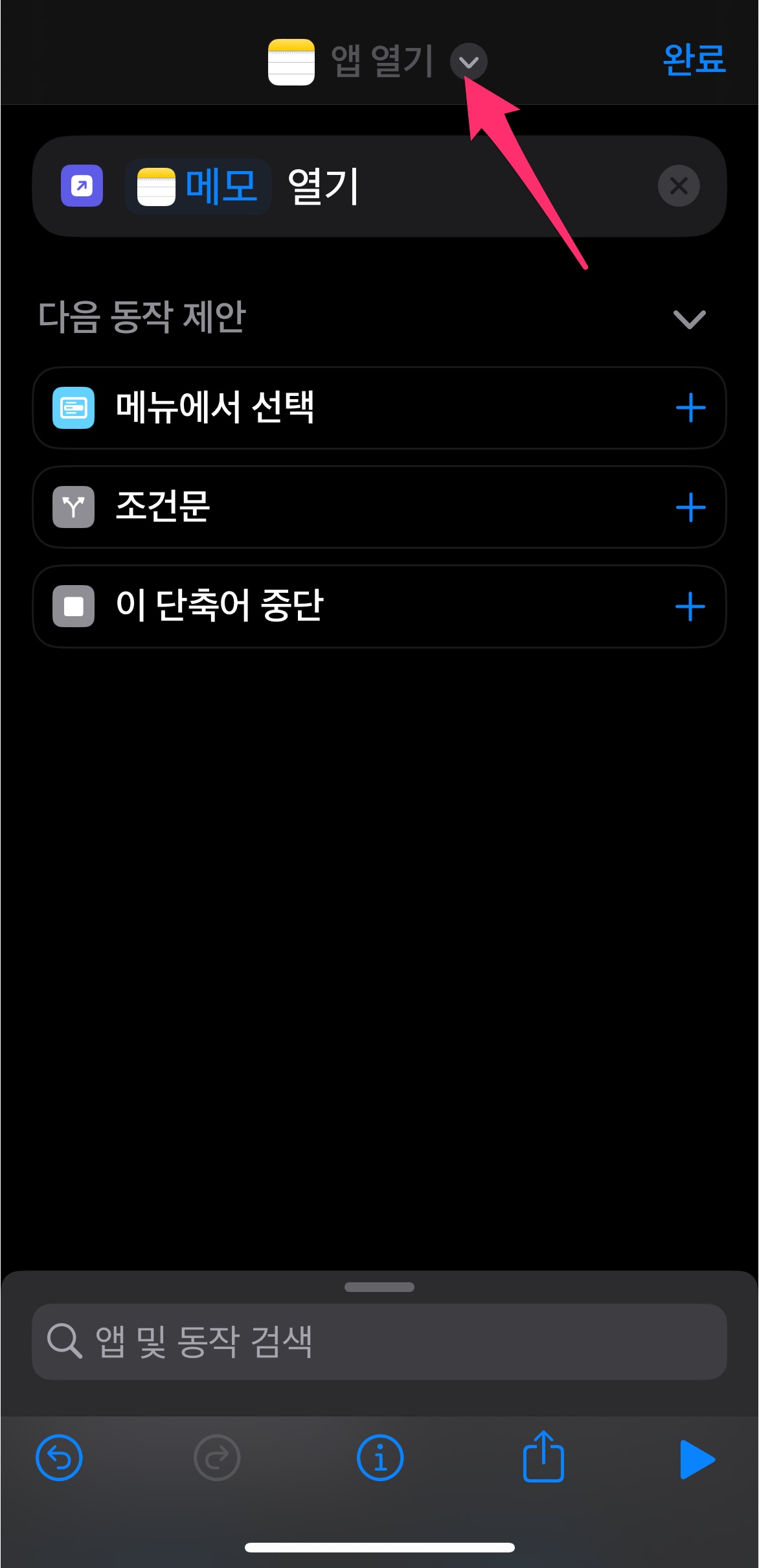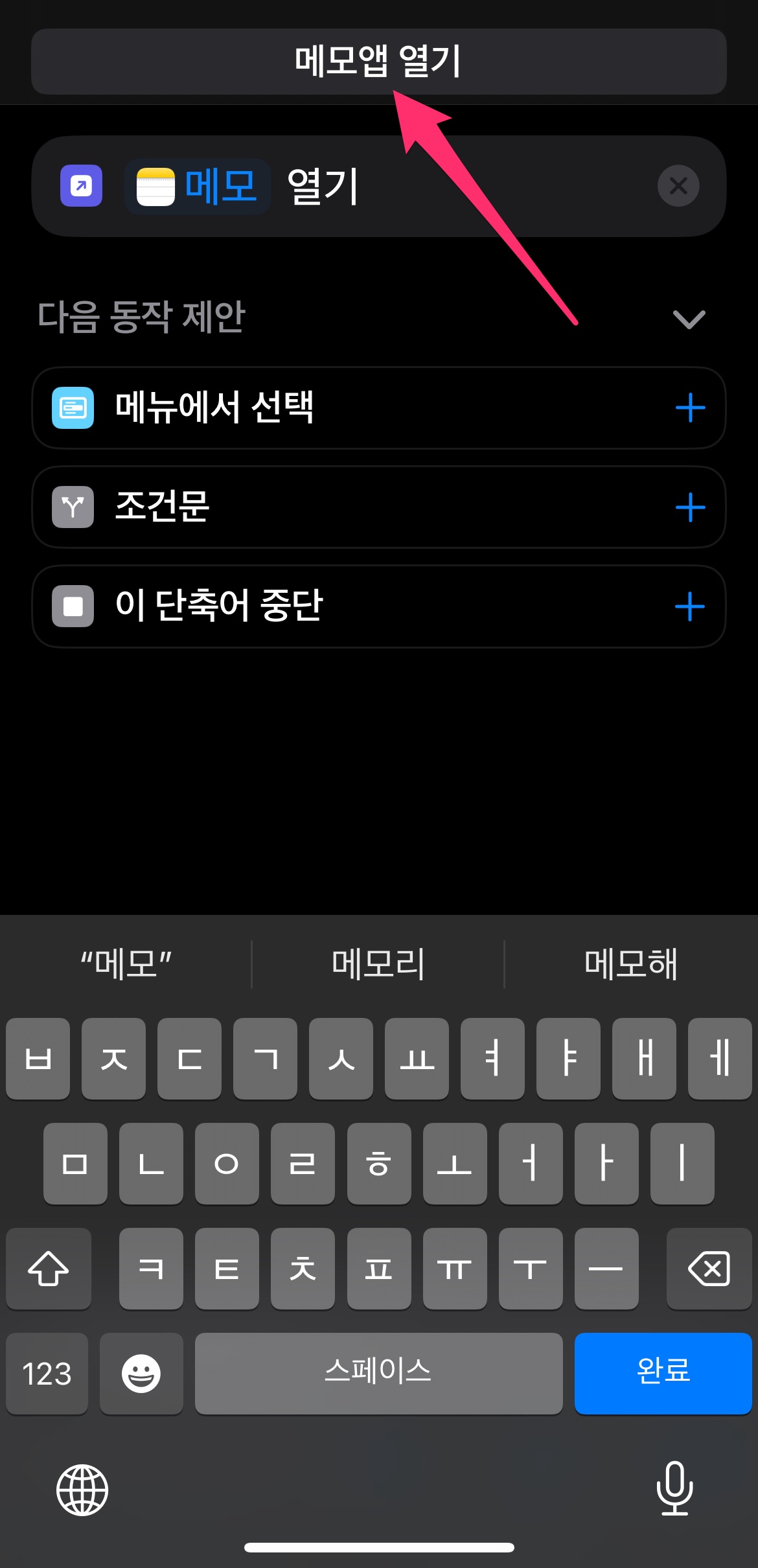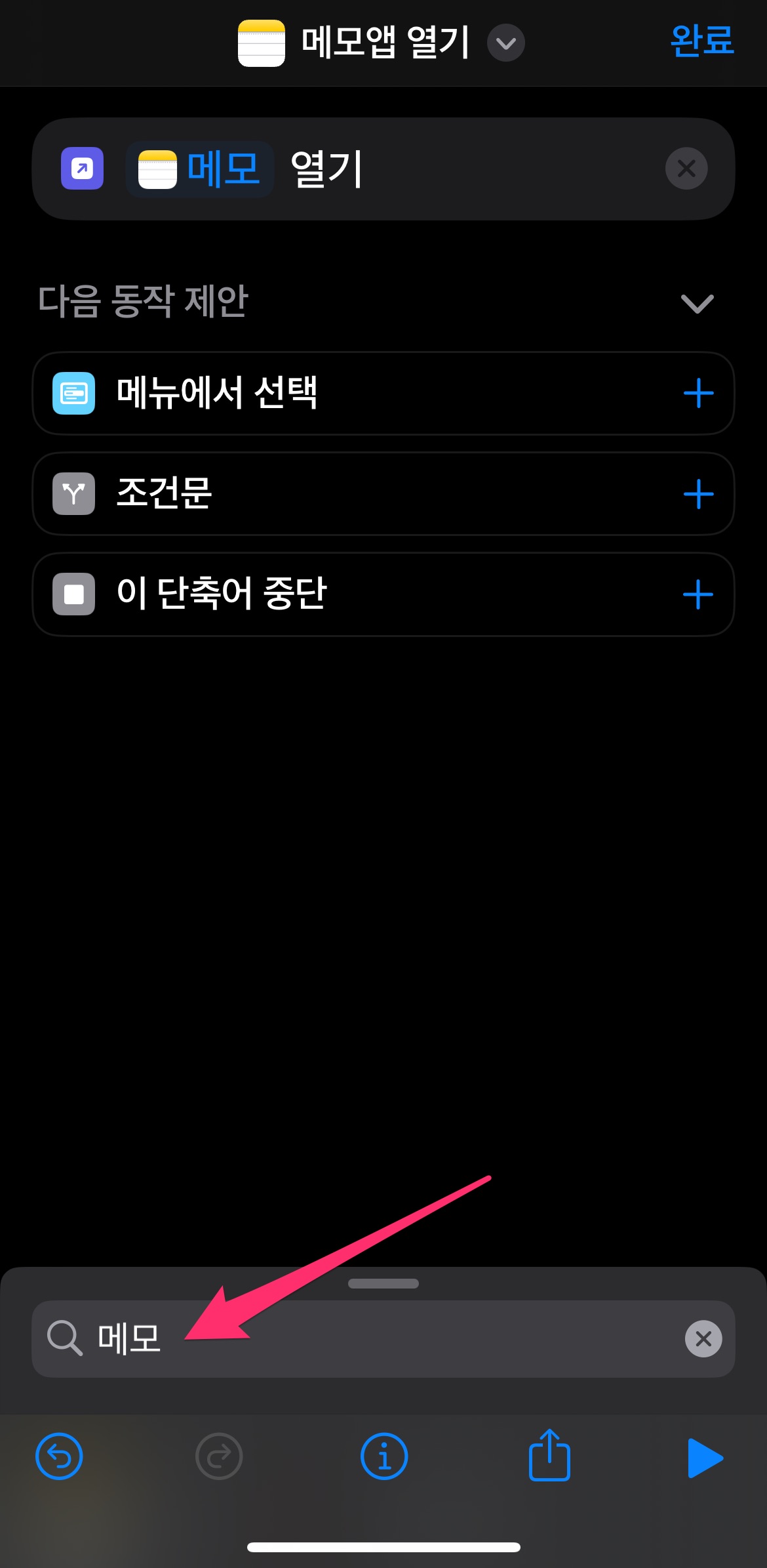 제일 밑에 있는 단축어 목록 중에서 방금 만든 단축어인 메모앱 열기를 선택합니다.
