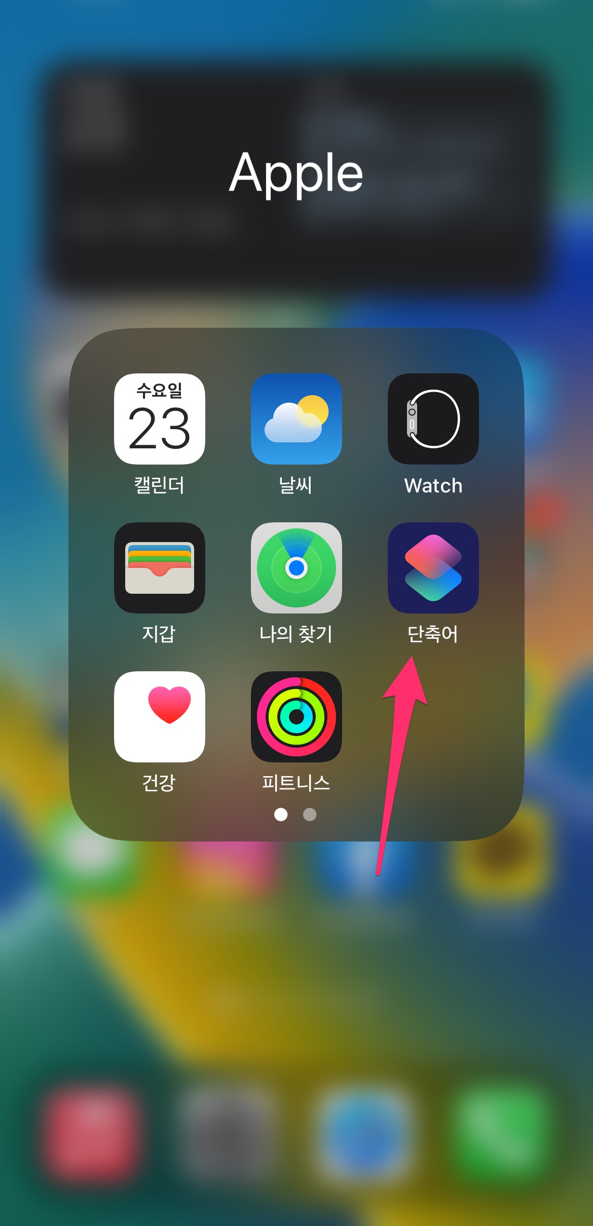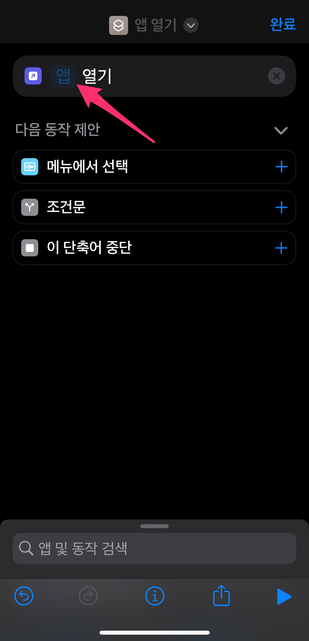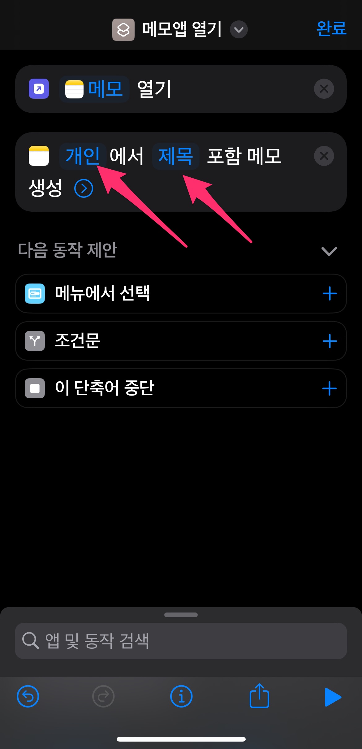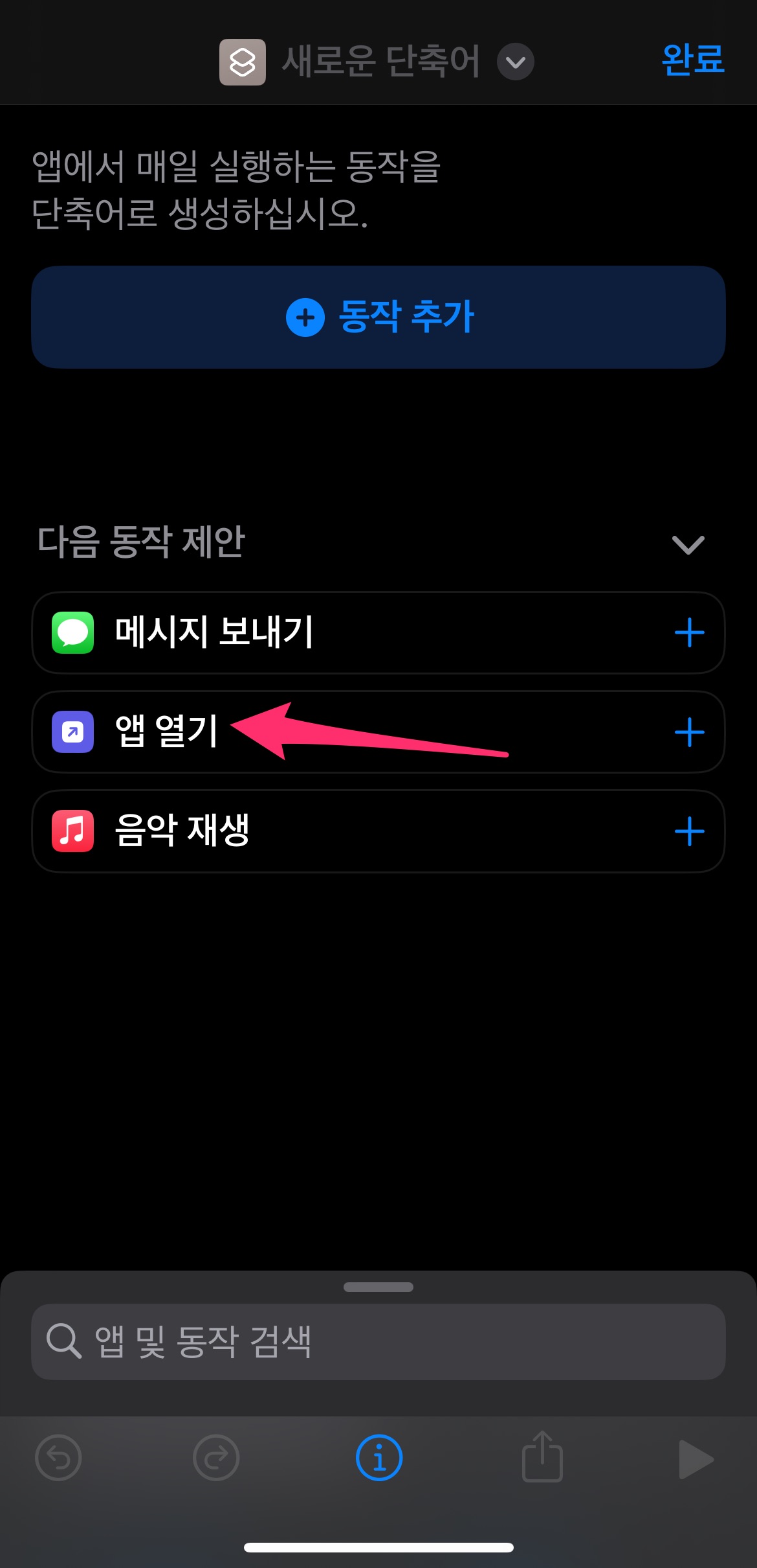 제일 밑에 있는 단축어 목록 중에서 방금 만든 단축어인 메모앱 열기를 선택합니다.