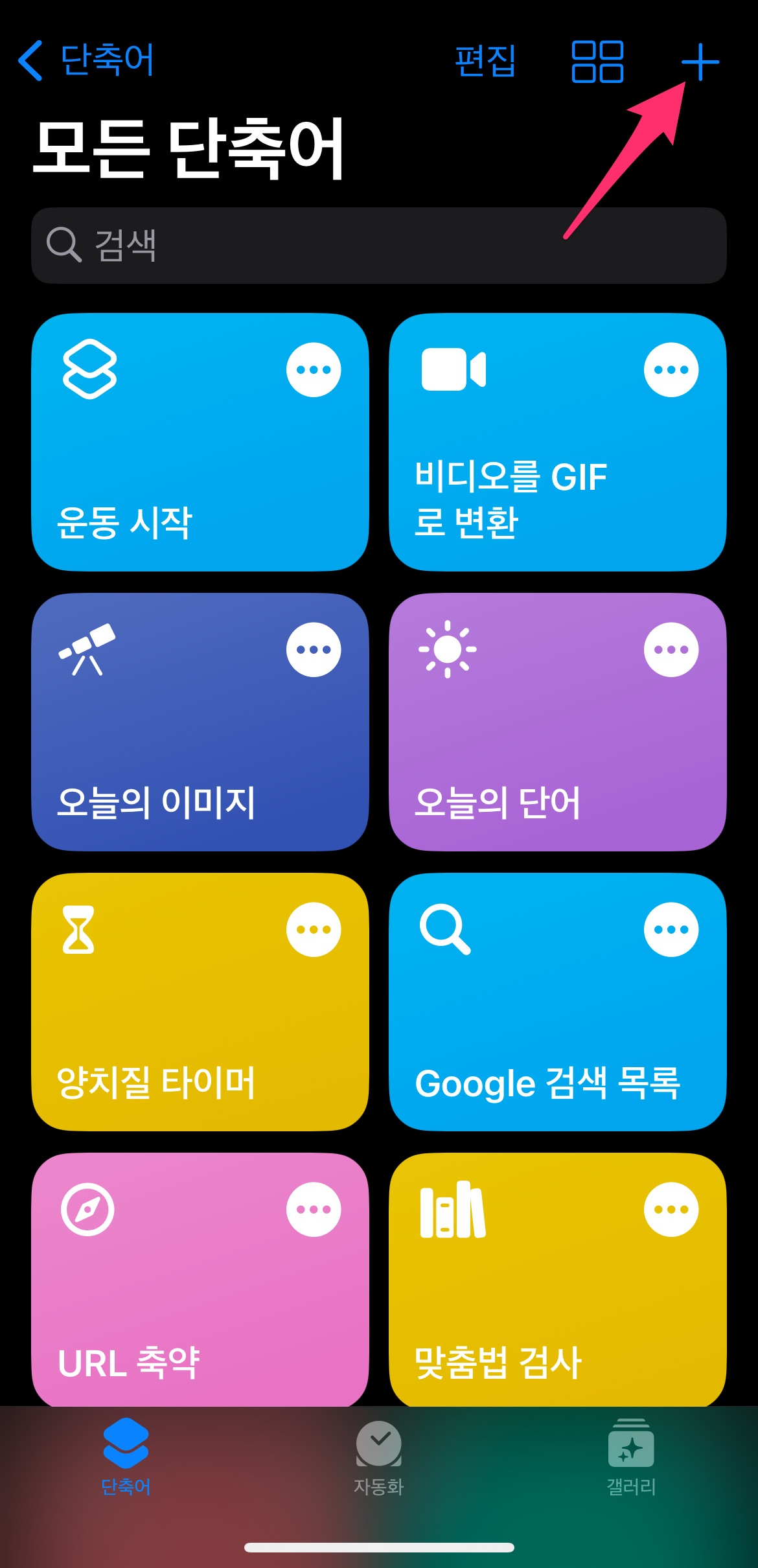 아이폰 단축어 앱을 실행하고 오른쪽 상단에 + 버튼을 선택합니다.