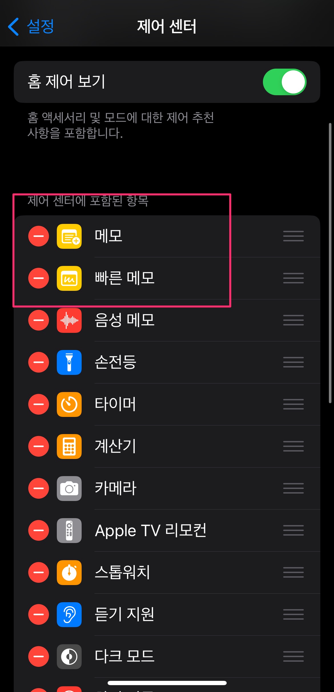 [제어 센터에 포함된 항목]에서 메모, 빠른 메모를 상단으로 올리면 제어 센터에서 바로 실행할 수 있는 아이콘이 생깁니다.