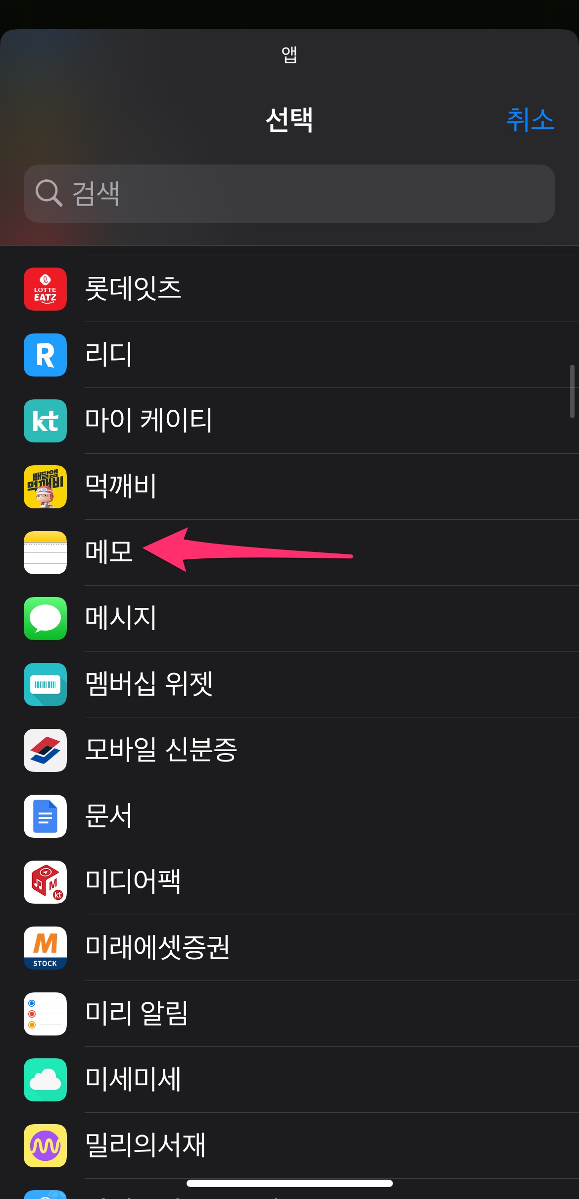 앱 목록 중에서 메모를 선택합니다.