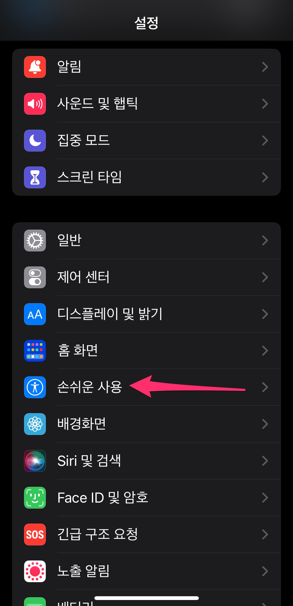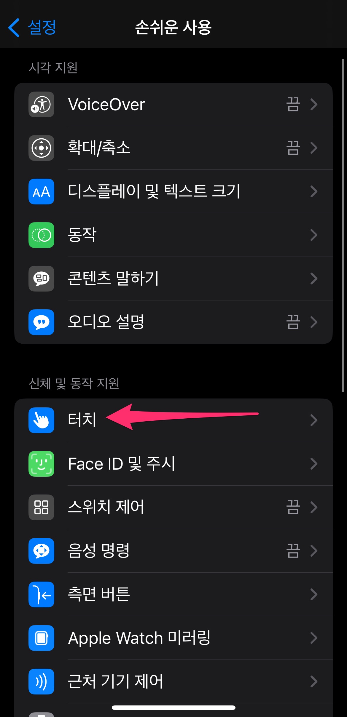 아이폰 [설정]에서 [손쉬운 사용]을 선택하고 [터치]를 선택합니다.