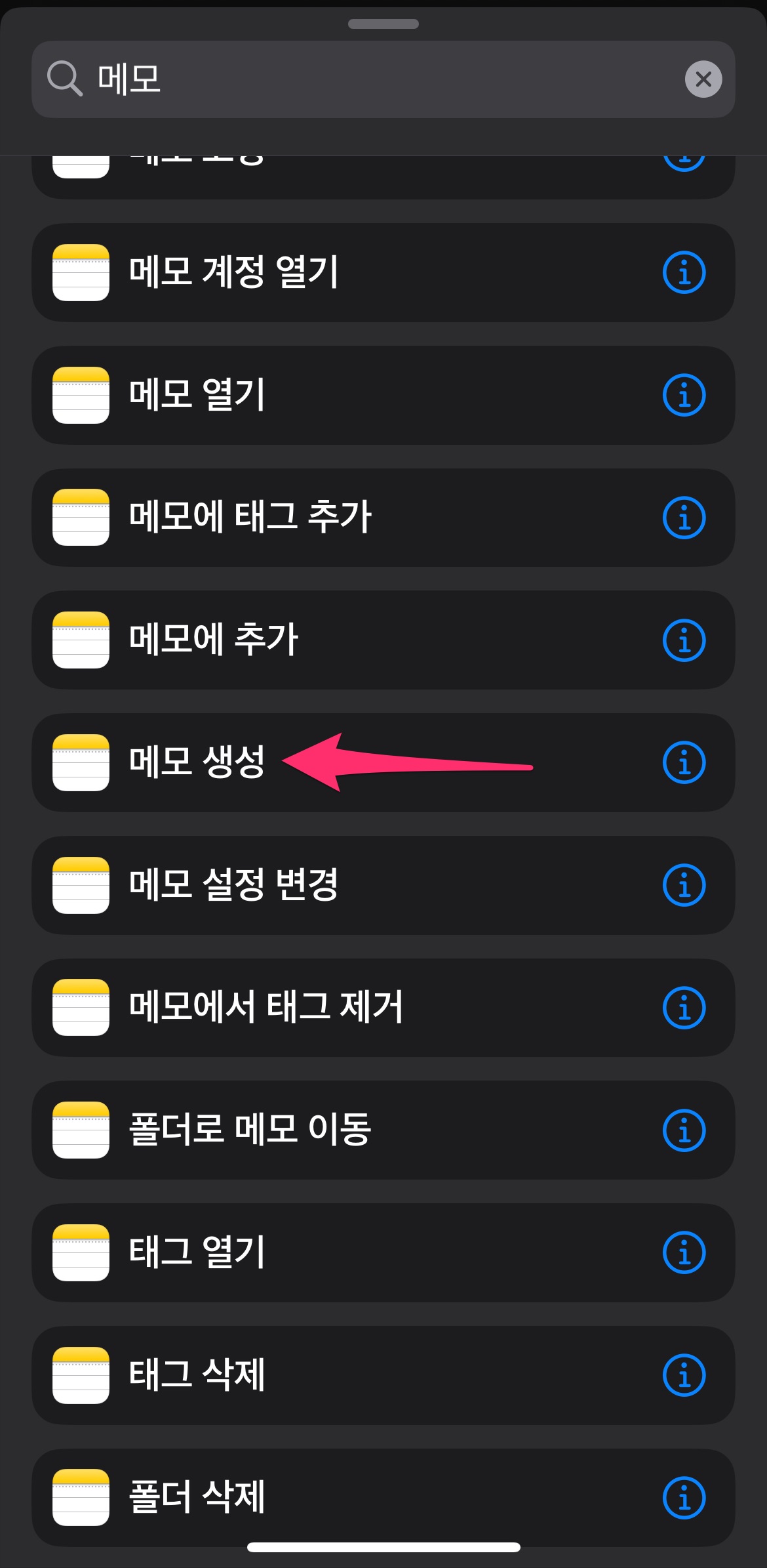 하단 검색창에 메모를 타이핑하면 메모에 관련된 명령어가 나옵니다.