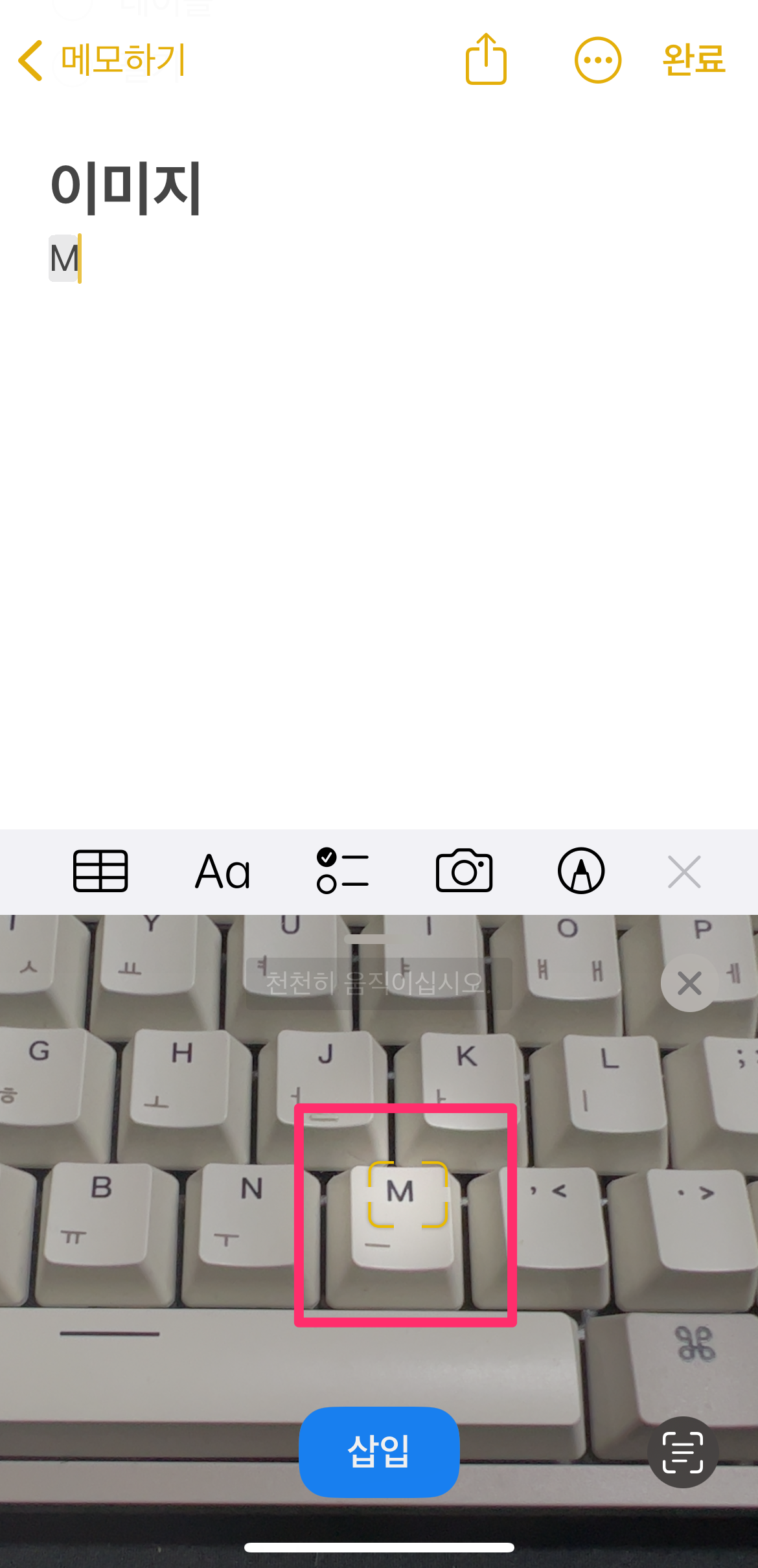 다른 기능은 해보시면 알 수 있고 텍스트 스캔을 선택하면 하단에 카메라가 켜지고 앵글 안에 있는 텍스트를 인식하여 메모에 삽입됩니다.
