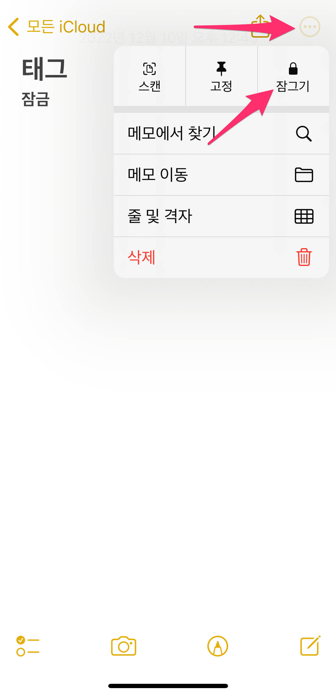생성한 메모가 개인적으로 보안이 필요하면 오른쪽 상단 점 3개를 선택한 후에 잠그기를 선택합니다.