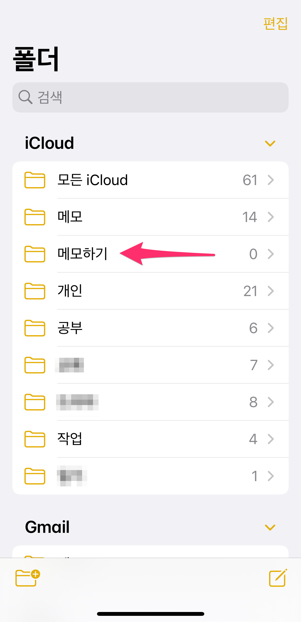 메모앱을 열고 왼쪽 하단에 폴더 생성 아이콘을 선택합니다.