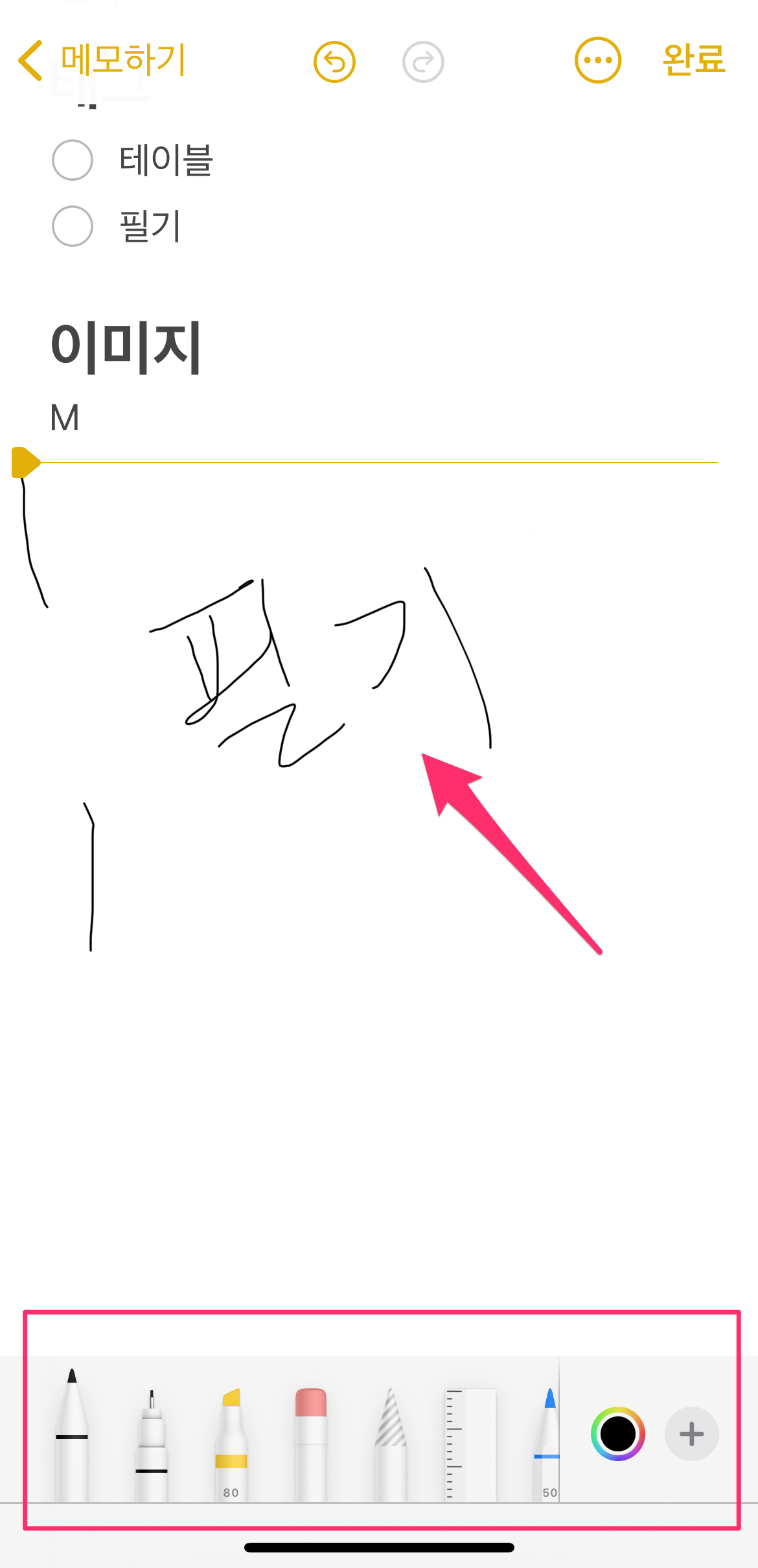필기 아이콘을 선택하면 다양한 펜을 이용하여서 손가락이나 호환되는 펜으로 필기할 수 있습니다.