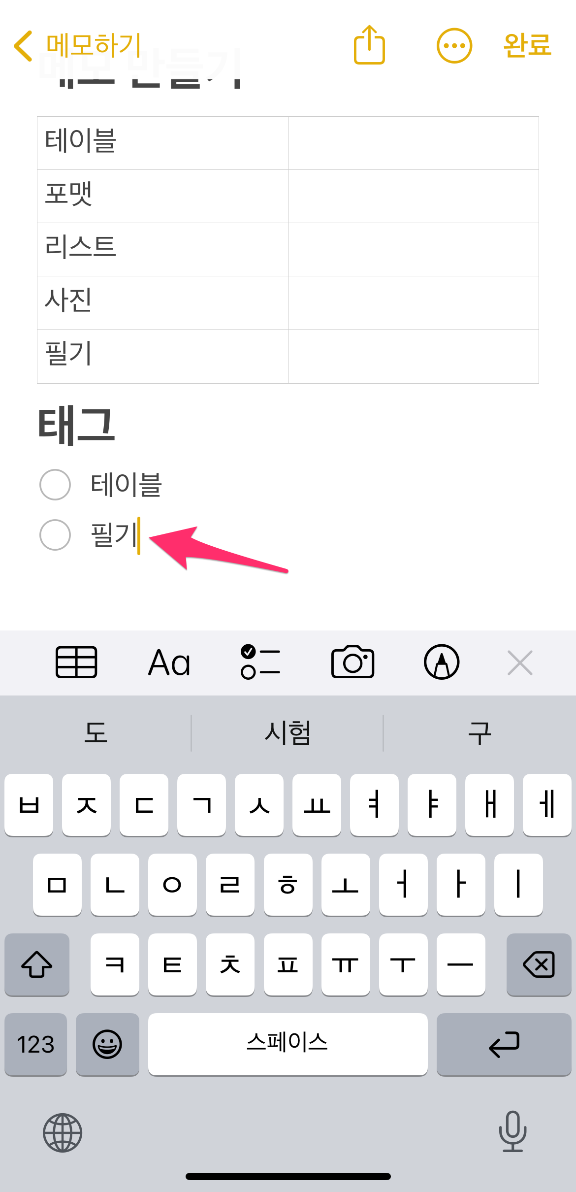 목록을 작성한 후에 리스트 아이콘을 선택하면 체크 리스트로 변경됩니다.