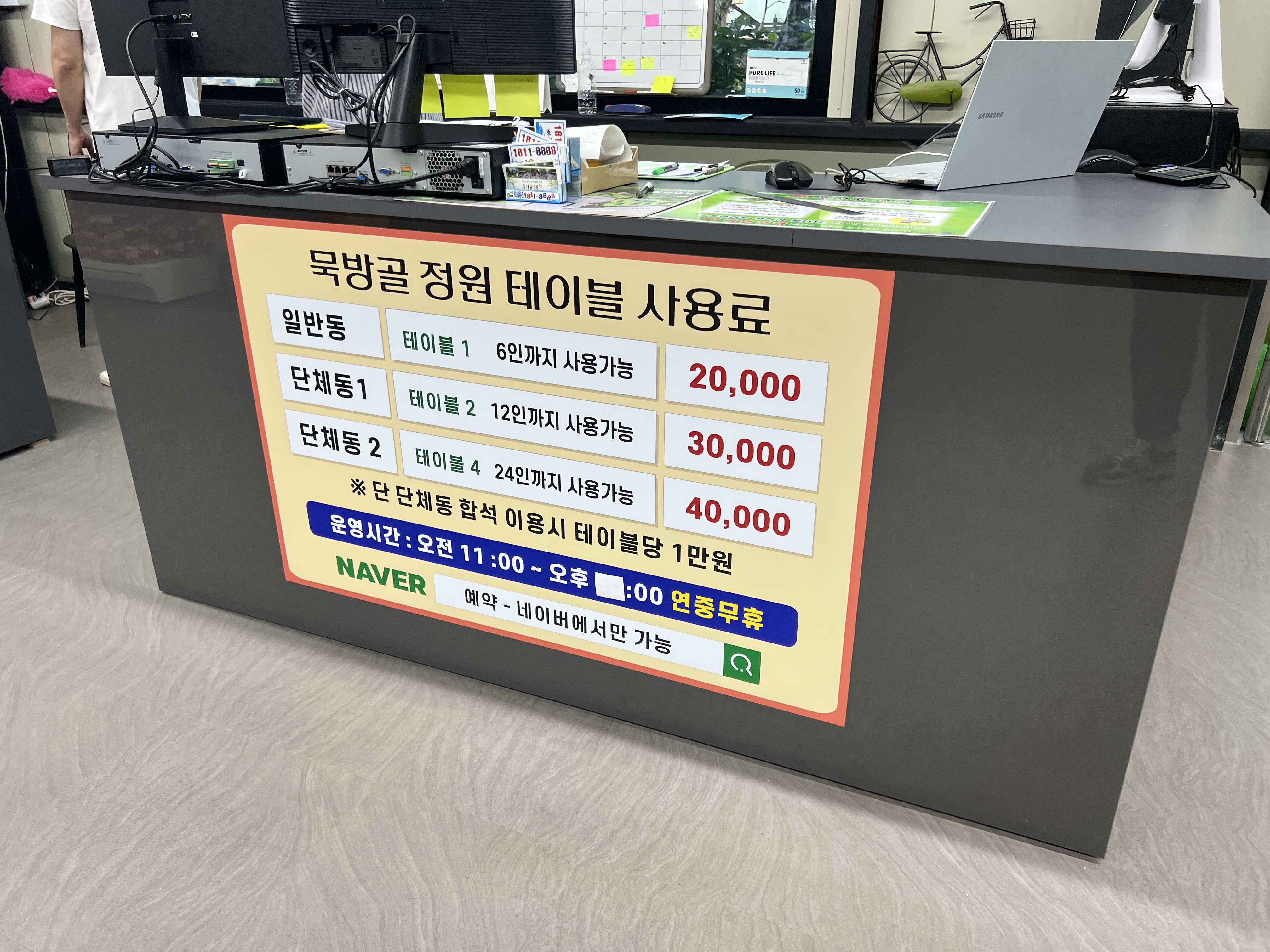 주차장을 지나시면 본동에 들어가신 후에 고기와 음식을 구입하신 후에 배정된 자리로 가시면 됩니다.