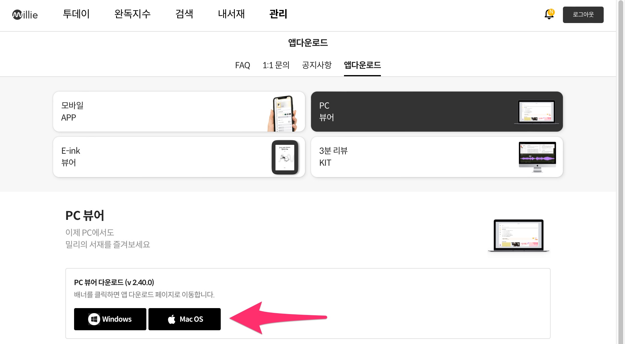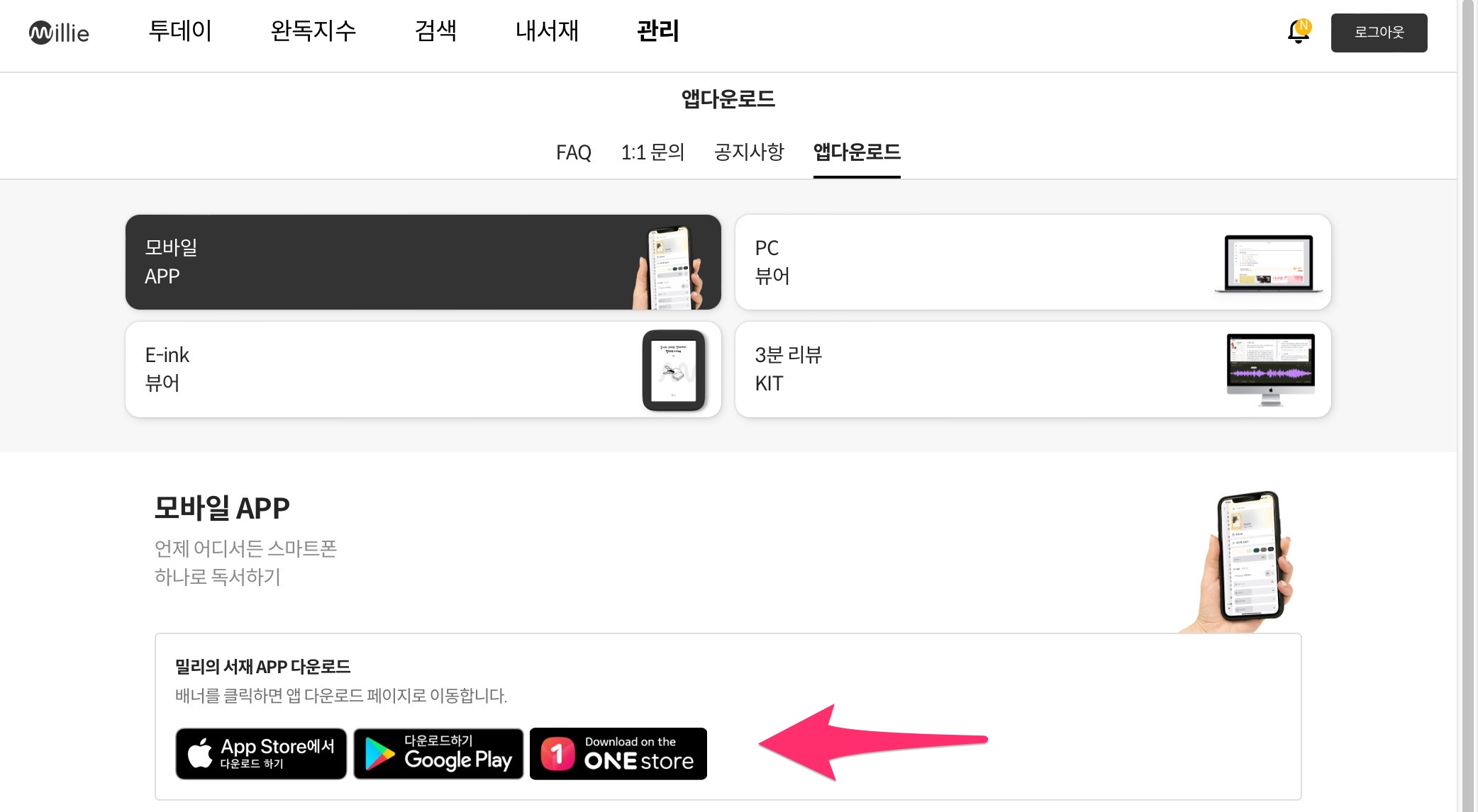 밀리의 서재는 스마트폰용 앱, PC 뷰어 등이 있습니다.