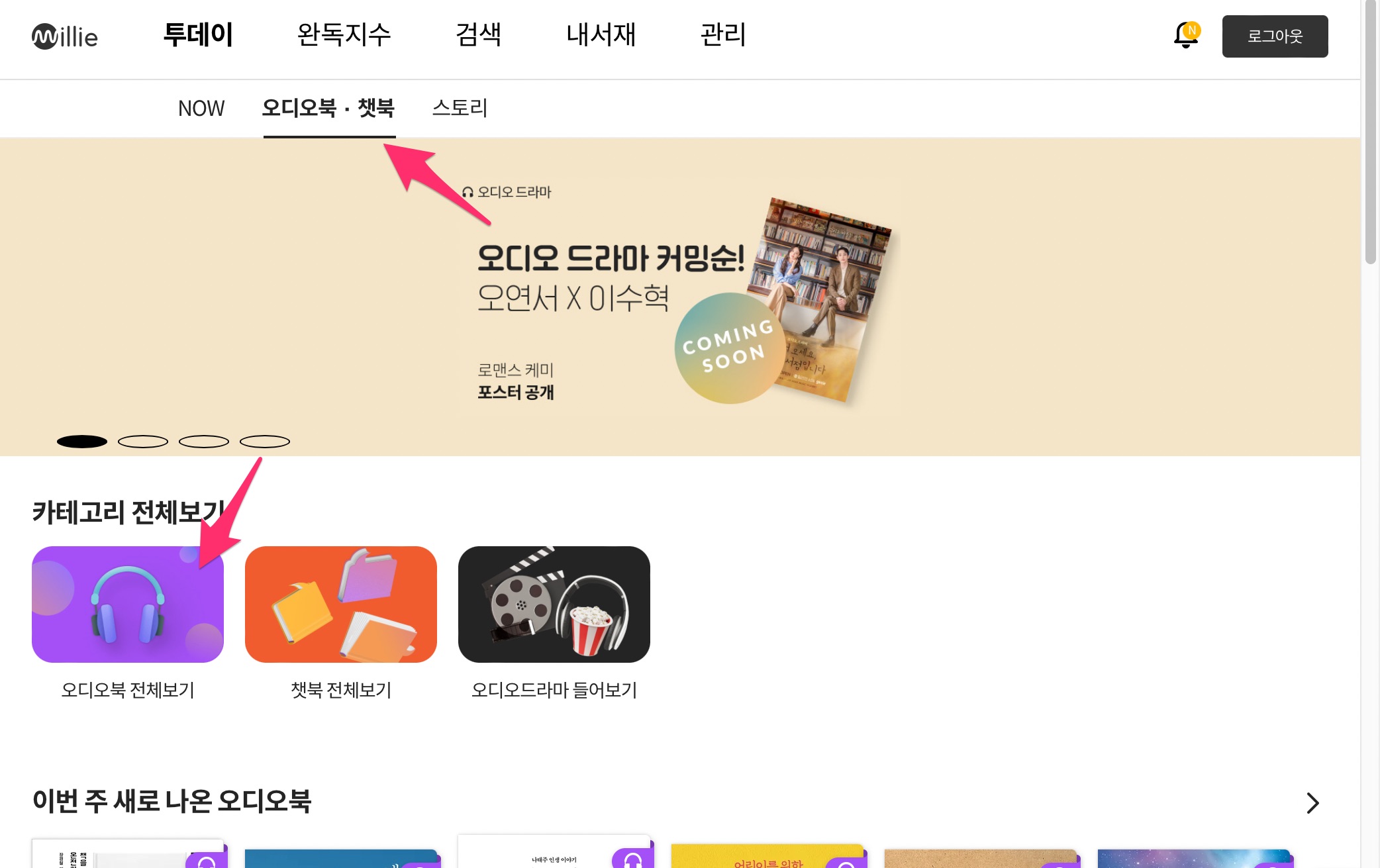 오디오북.챗북을 선택한 후에 오디오북 전체보기를 선택합니다.