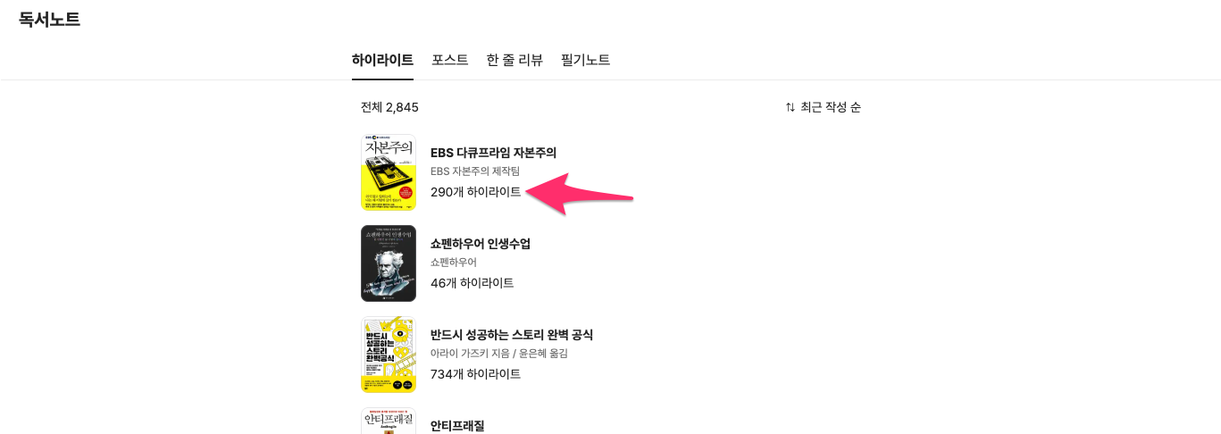책 제목 밑에 하이라이트를 클릭합니다.