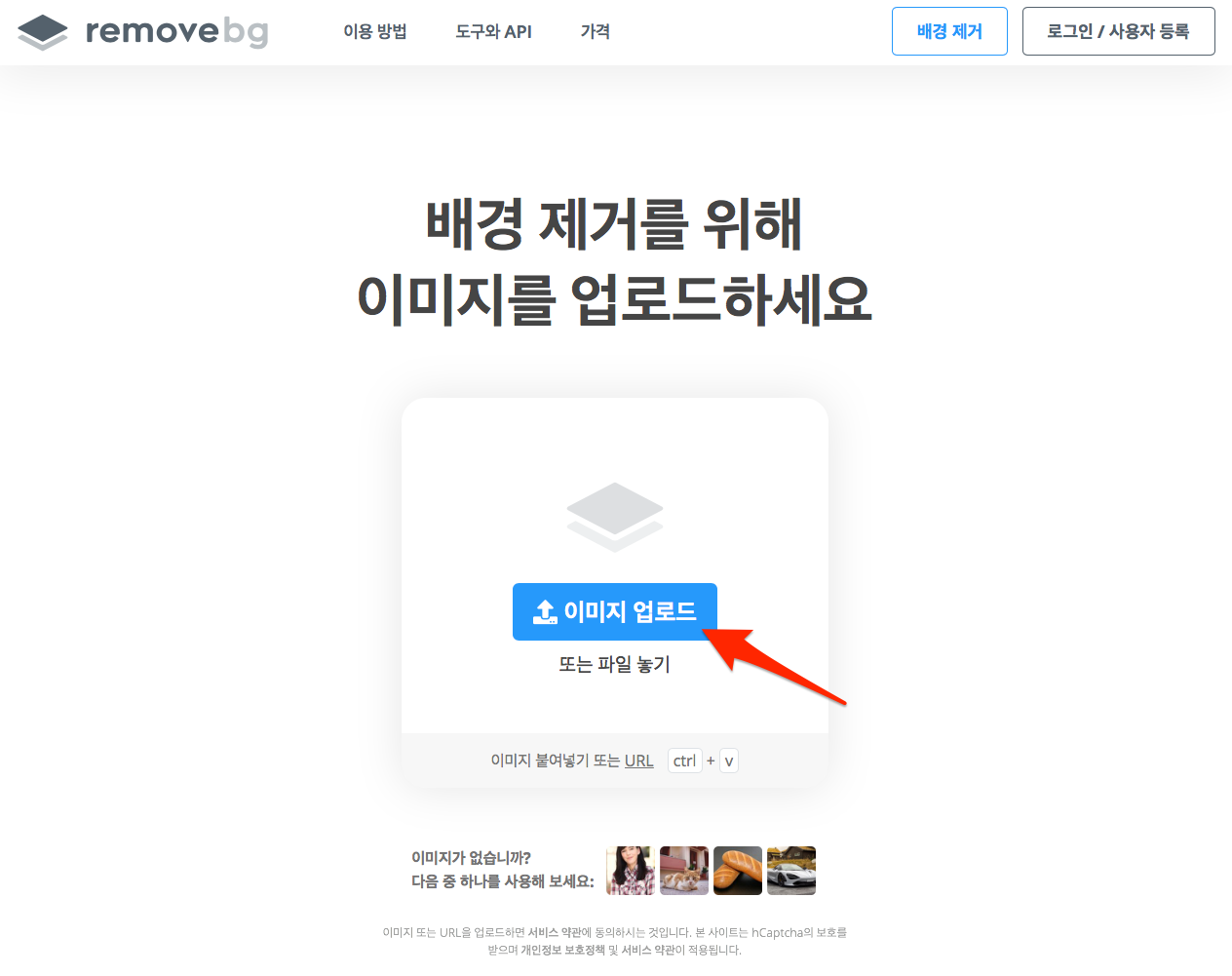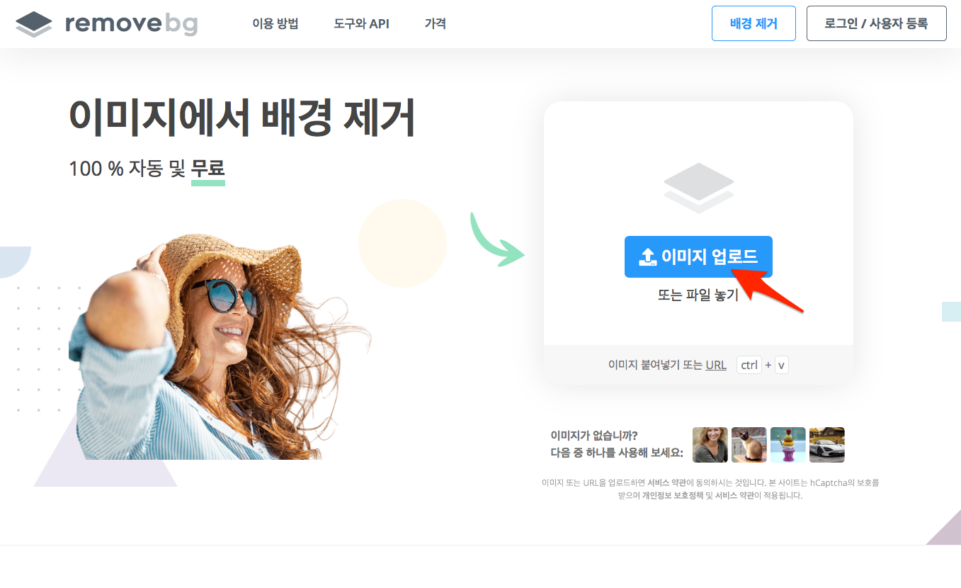 크롬 브라우저(권장)에서 remove.bg 사이트를 접속한 후에 [이미지 업로드] 버튼이나 상단에 [배경 제거] 버튼을 클릭하세요.